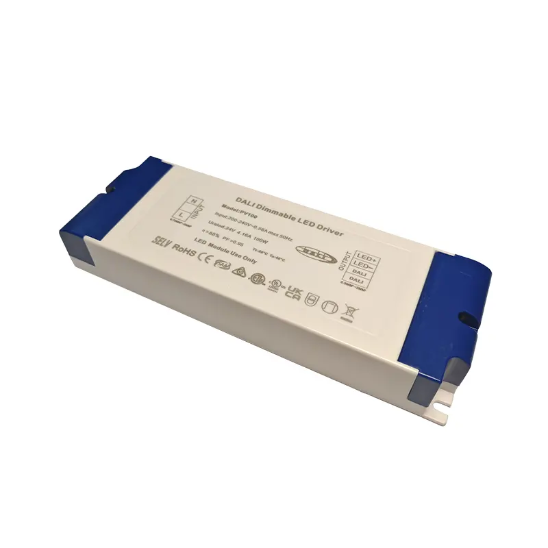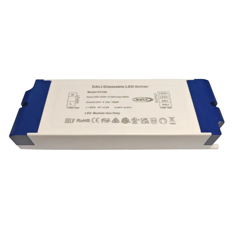 Како професионален производител на DALI драјвери со постојан напон во Кина, Starwell може да ви обезбеди висококвалитетен DALI драјвер со постојан напон од 100W за апликации со затемнување од 24V, кој нуди стабилен излез од 24V/4,16A DC со ефикасност до 90%. Поддржува непречено затемнување без треперење од 100% до 0,1% и има сеопфатни функции за заштита од краток спој, пренапон, преоптоварување и преголема температура.
