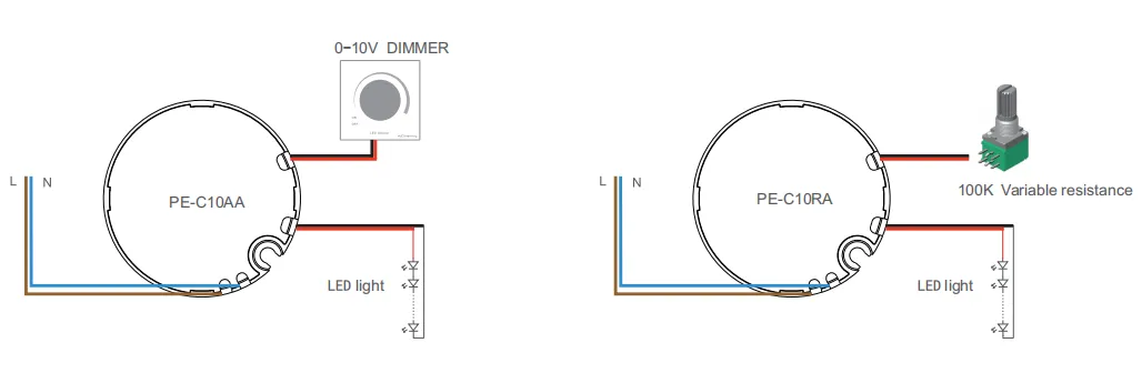 1. Разлика помеѓу pe-c10aa и pe-c10ra: pe-c10aa е затемнување од 0-10V / 1-10V / PWM, а pe-c10ra е специјално затемнување за 100k променлив отпор 2. Измерените параметри се изведуваат под влезна 230V AC околина од 25 степени 3. Напојување со постојана струја, во состојба без затемнување, излезната струја е максималната поставена вредност 4. Напонот поврзан со светилката треба да биде во означениот опсег на напон на напојувањето 5. Овој производ го прифаќа процесот на дисипација на топлина од силика гел со спроводливост на топлина за да ја балансира внатрешната температура и да ја обезбеди безбедноста и сигурноста на производот 6. Тест растојание на сигнална линија: 1,5m2 заштитена линија, 200m со 40 напојувања. Поради факторот растојание, растојанието се продолжува, а бројот на контроли ќе се намали. Должината на сигналната линија е Зголемувањето ќе доведе до сигнал слабеење, така што бројот на контролирани светилки ќе се намали со зголемувањето на контролното растојание |