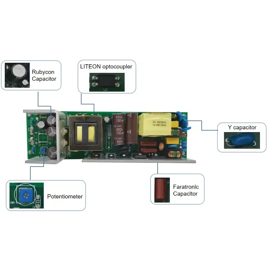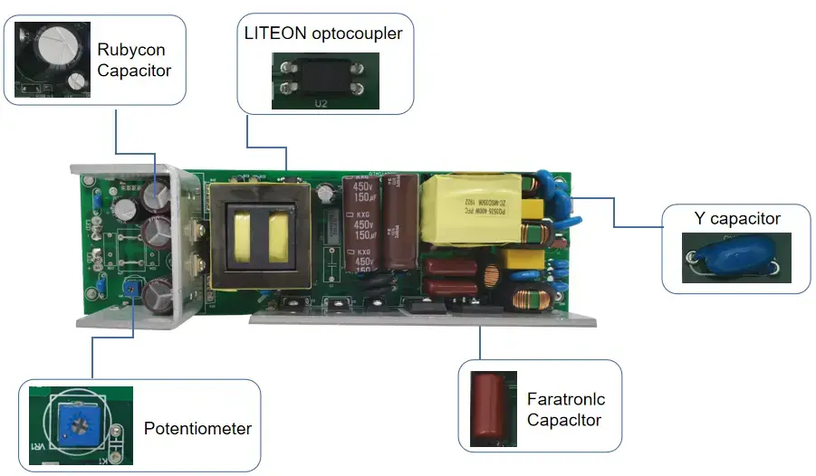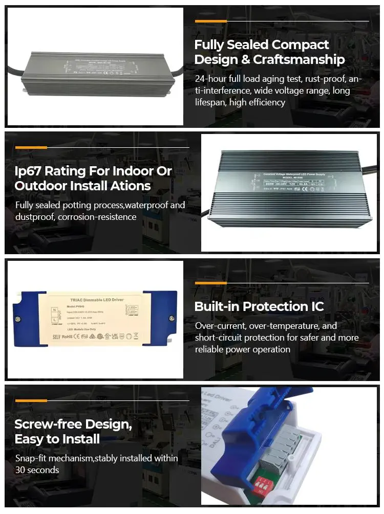 Прецизна постојана струја · Долготрајна издржливост: STARWELL константна струја триак затемнувачка LED двигател усвојува високопрецизен чип со постојана струја. Грешката на излезната струја е ≤ ± 3%, излезната струја е стабилна на 1200 mA, а длабочината на треперење е <5%, со што се елиминираат проблемите со треперењето и слабеењето на светлината. Може да го продолжи работниот век на LED светилките за повеќе од 30%, а неговиот континуиран работен век може да достигне 50.000 часа значително да ги замени трошоците за одржување.