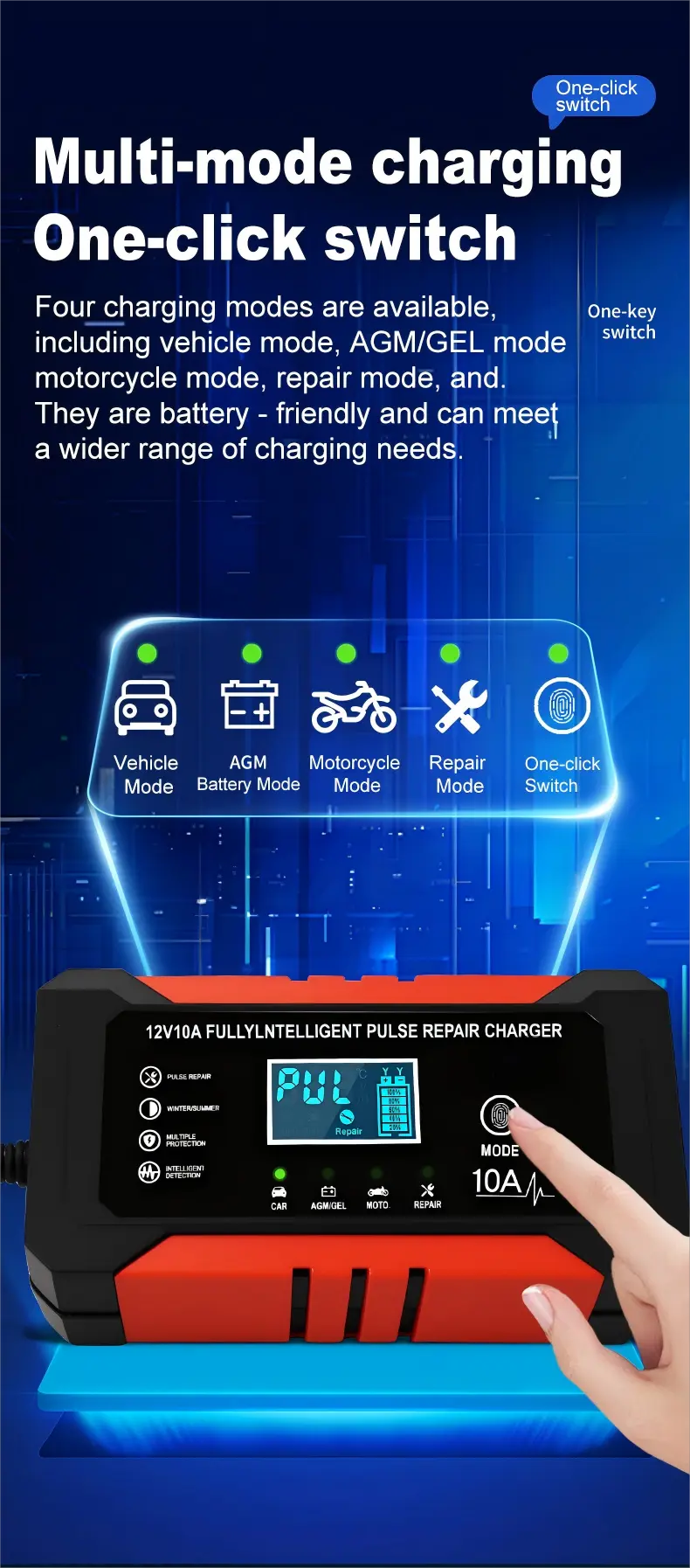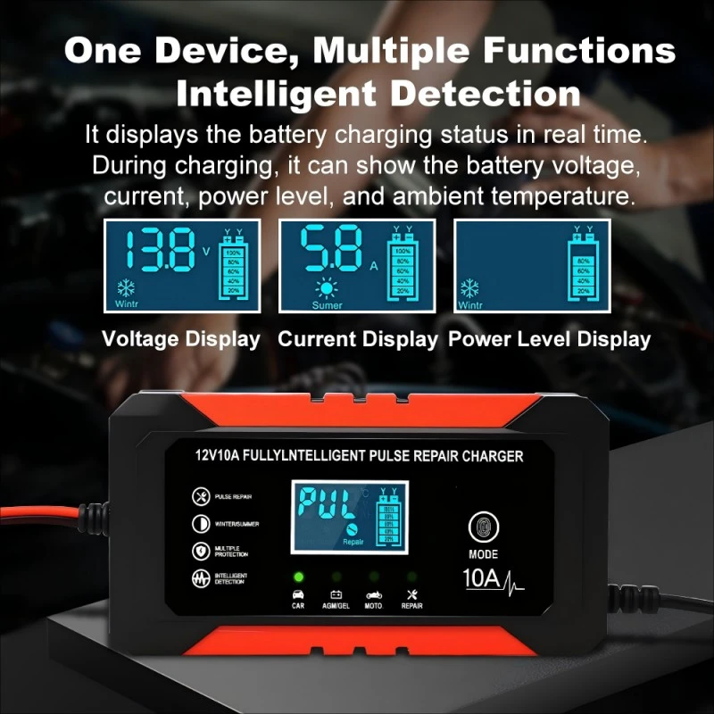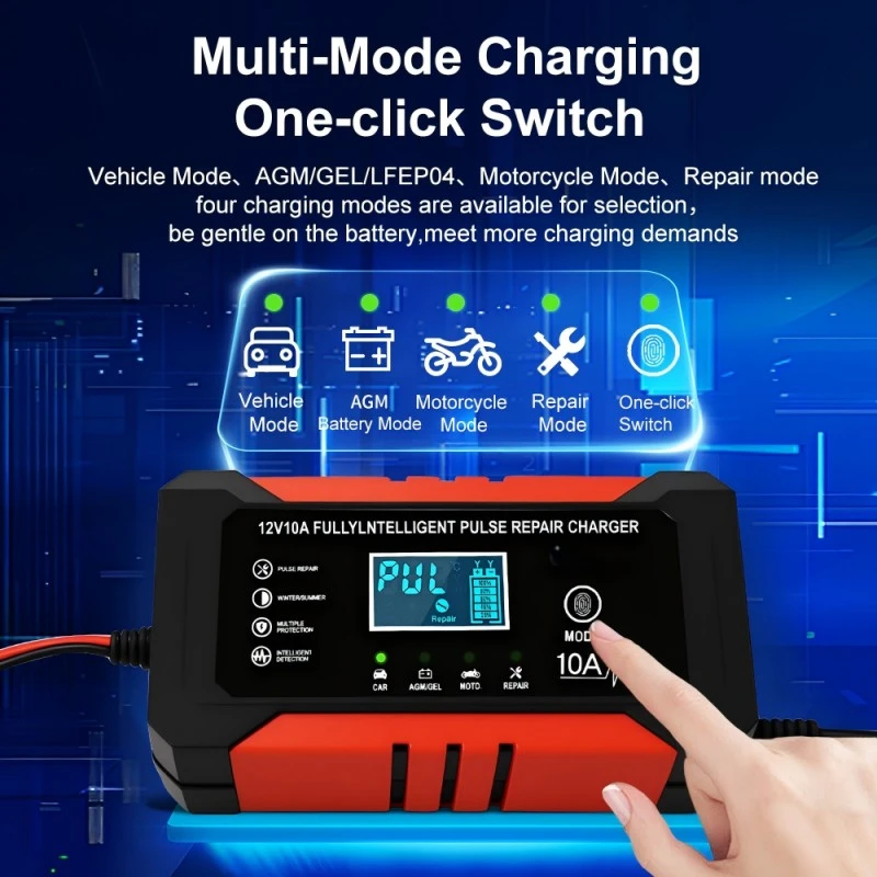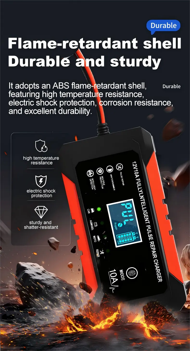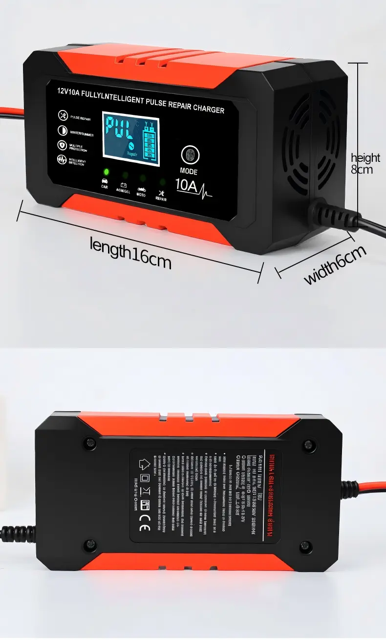 Опремен со прецизни технички спецификации, овој интелигентен полнач за батерии располага со универзален опсег на влезен напон од 110~230V AC (50/60Hz), обезбедувајќи компатибилност со електричните мрежи ширум светот. Обезбедува стабилен излез од 12V DC со струја за полнење од 10А, обезбедувајќи постојана моќност за брзо полнење на батериите - способна целосно да наполни оловно-киселинска батерија од 100 Ah за приближно 10 часа, значително побрзо од стандардните полначи од 5А. Со енергетска ефикасност од над 95%, го минимизира трошењето енергија, додека неговото компактно алуминиумско куќиште (170×90×50mm, 1,0kg) обезбедува преносливост и издржливост.