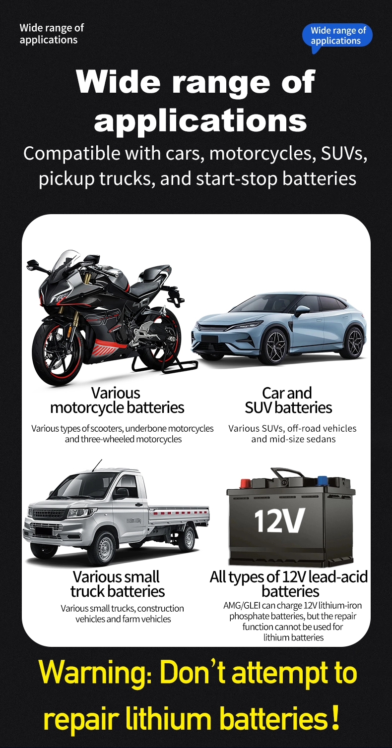 1. Универзална компатибилност и поддршка за повеќе батерии: Работи беспрекорно со сите типови батерии од 12 V, вклучително и со оловна киселина, AGM, гел и LiFePO4, покривајќи ги капацитетите на батериите од 6Ah до 180Ah. Широкиот влезен опсег од 110~230V ги елиминира регионалните ограничувања, што го прави употреблив во над 100 земји и региони ширум светот.