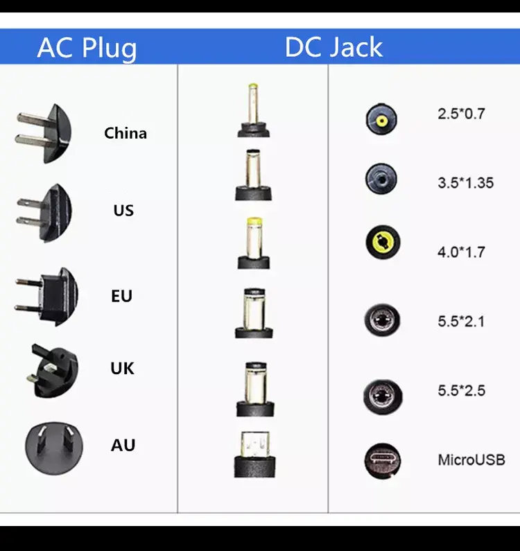 Тип на конектор: Стандарден конектор за DC буре (вообичаени големини вклучуваат 5,5mm×2,1mm или 5,5mm×2,5mm, приспособливи врз основа на барањата на уредот).