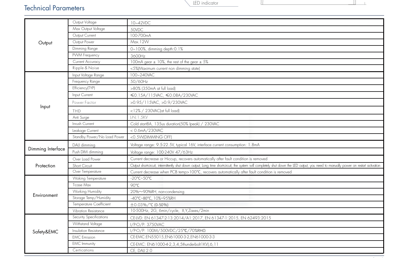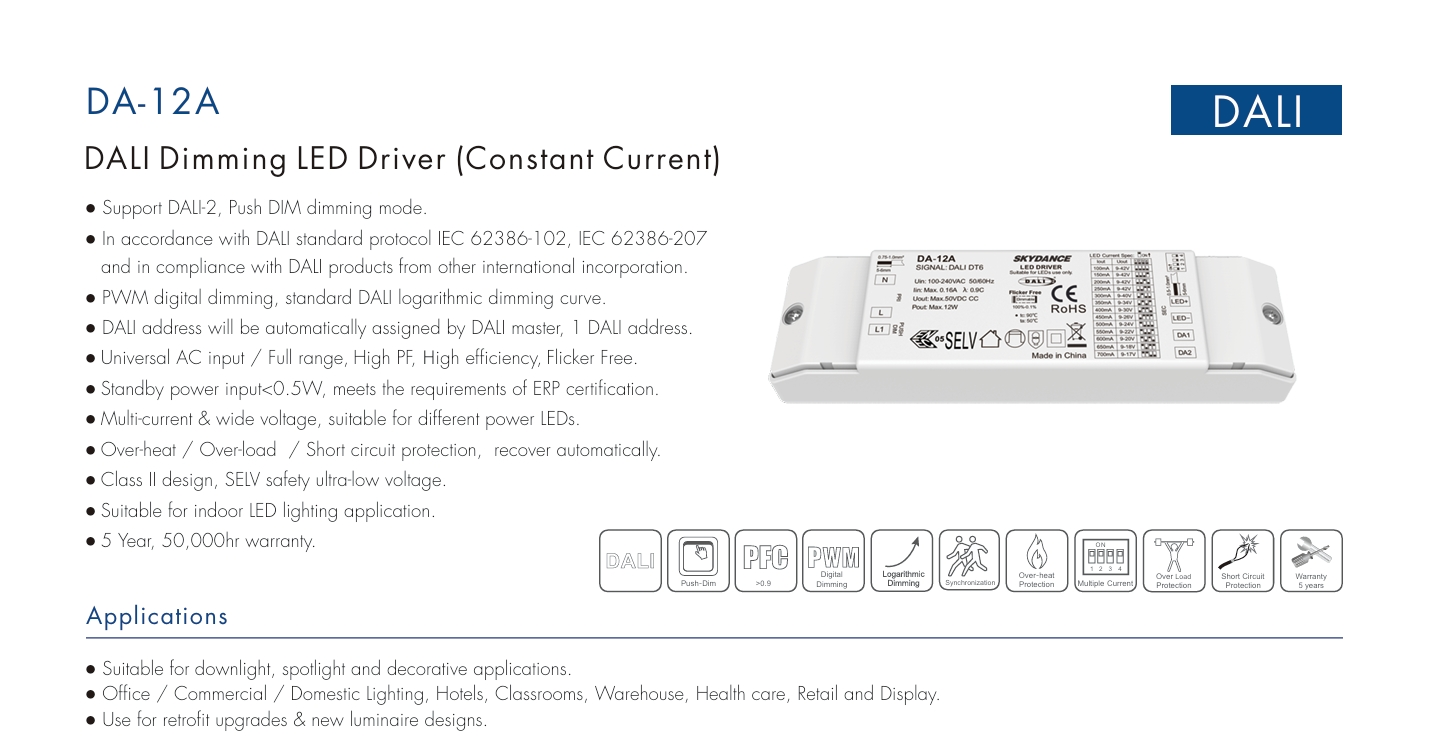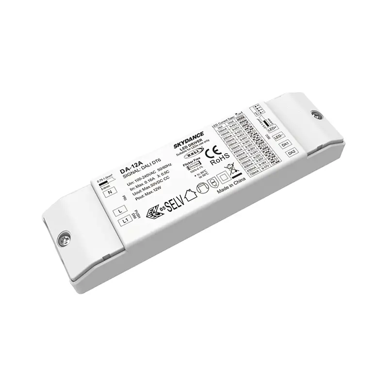 Фабричкиот STARWELL висококвалитетен 12W постојана струја DALI Dimmable LED драјвер е јадро со високи перформанси за интелигентни системи за осветлување, компатибилно со глобалните DALI протоколи и 100-240V AC широк влез. DALI Dimmable LED драјверот обезбедува стабилен излез на константна струја (прилагодлив 100-900mA) со ±5% точност, обезбедувајќи постојана осветленост низ тела. Со технологијата за затемнување T-PWM, тој постигнува ултра-длабоко затемнување од 0,0001%-100% без треперење, исполнувајќи ги стандардите IEEE 1789 за удобност на очите. Со PF>0,95 и до 87% ефикасност, го намалува трошењето енергија, додека заштитата IP20 и опсегот на работна температура од -20~50℃ одговараат на станбени, комерцијални и индустриски сценарија.