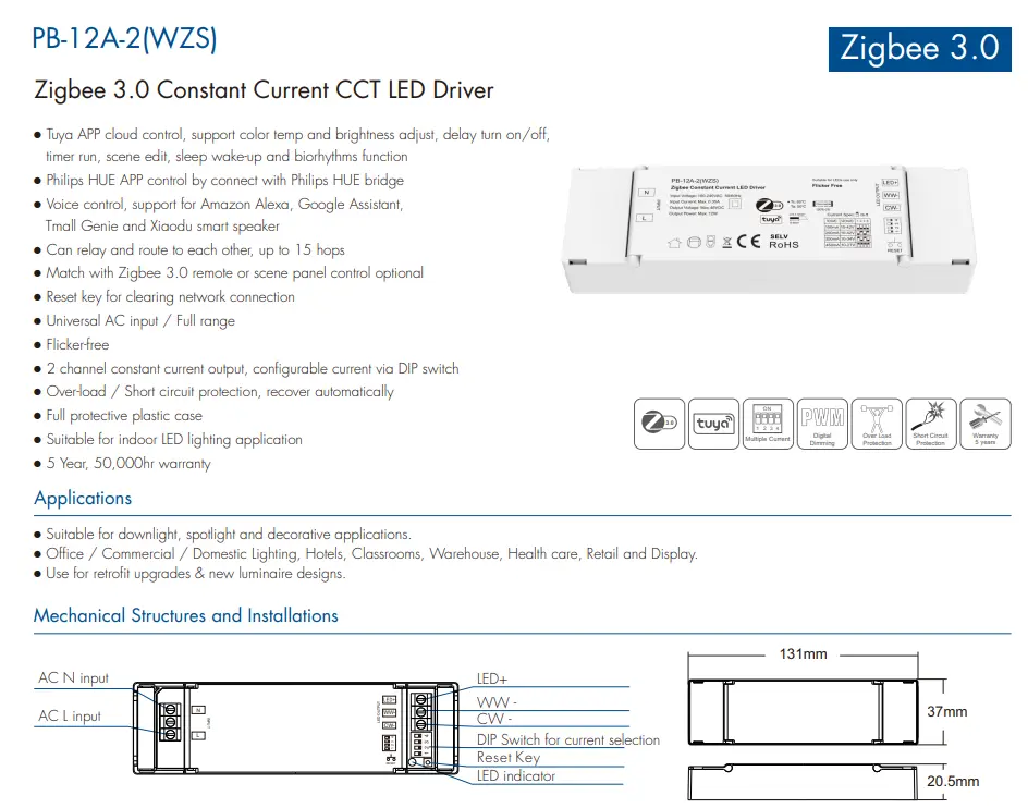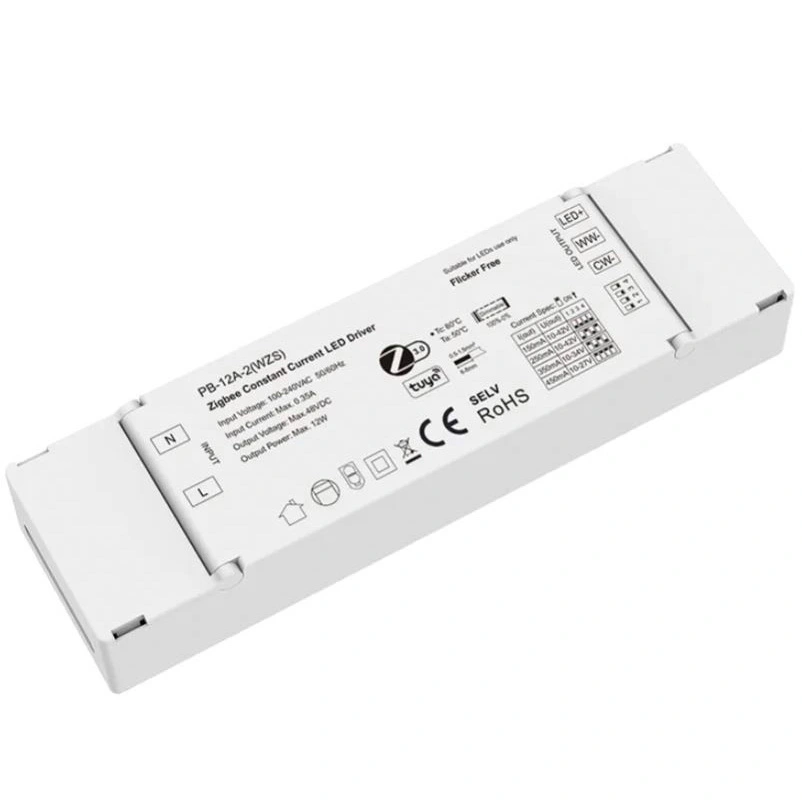 CE-сертификуваните 12W TUYA Zigbee CCT LED драјвери за затемнување на фабриката STARWELL се високоефикасно решение за паметна моќност на осветлувањето дизајнирано за модерни системи за осветлување на станбени и комерцијални. Поддржува широк влезен напон од 100~240VAC 50/60Hz, овозможувајќи стабилна глобална примена. Со номинална излезна моќност од максимум 12 W, овој двигател реализира непречена контрола на затемнување CCT врз основа на безжичниот протокол TUYA Zigbee, овозможувајќи им на корисниците далечинско да ги приспособат и осветленоста и температурата на бојата преку APP, гласовни асистенти и паметни сцени.