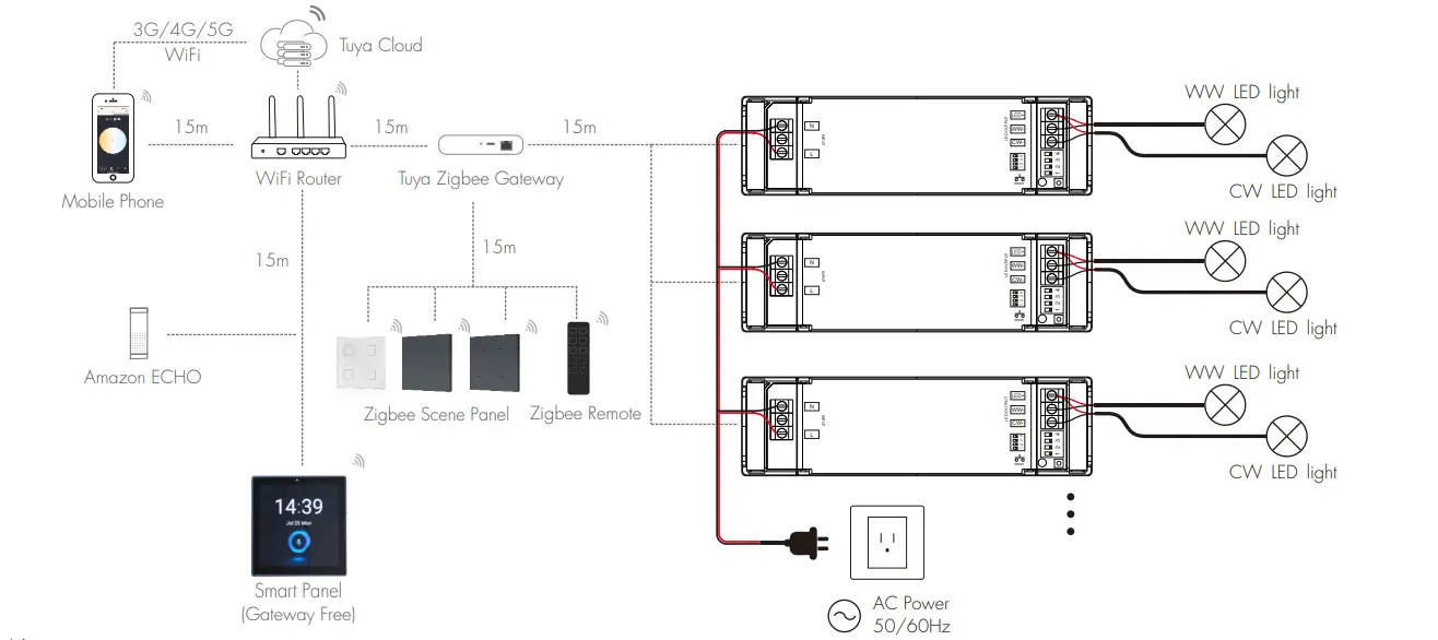 TUYA Zigbee LED драјверот целосно го поддржува протоколот TUYA Zigbee за стабилно безжично поврзување, постигнувајќи непречено CCT без треперење и намалување на осветленоста. Поддржува APP контрола, гласовна контрола, групна контрола и режим на сцена, што им носи голема удобност на паметните системи за осветлување.