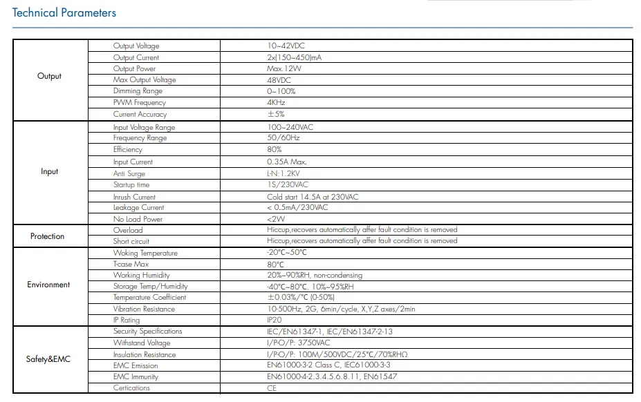 Со универзален влез од 100~240 VAC, LED драјверот со затемнување CCT се прилагодува на глобалните електрични мрежи. Висока ефикасност до 85% и фактор на моќност ≥0,90 помала потрошувачка на енергија и производство на топлина, што го продолжува животниот век и на возачот и на LED диодата.