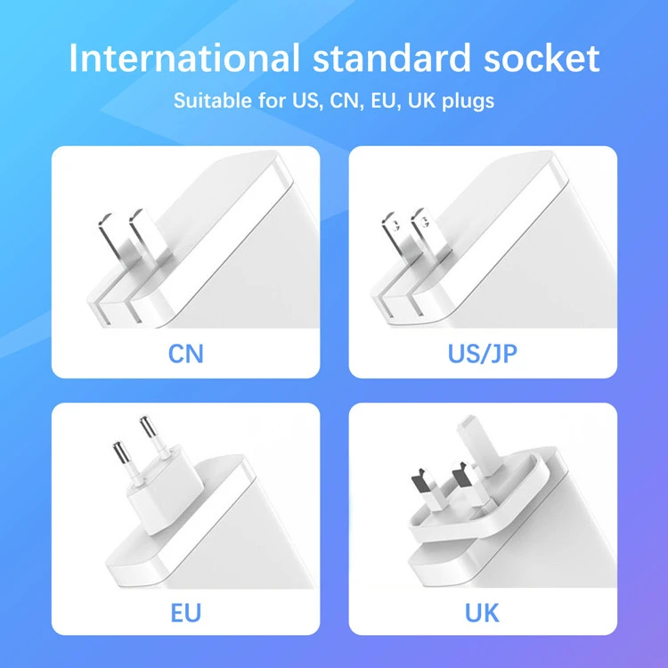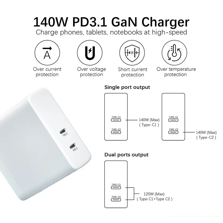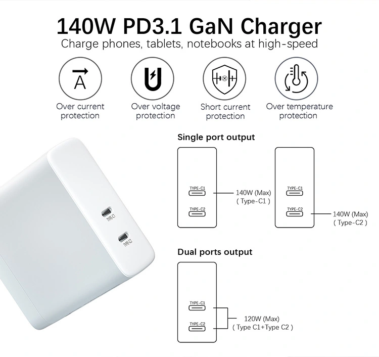 140W двојна USB c порта PD полнач САД приклучок што се преклопува: Единечната порта може да обезбеди моќност до 140 W. Излезната моќност на двојните порти е интелигентно распределена истовремено. При полнење на лаптоп и мобилен телефон истовремено, ефикасноста останува непроменета.