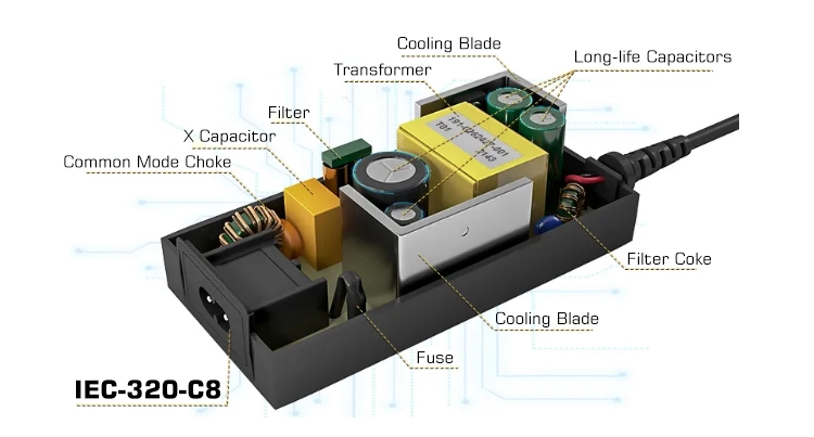 Опремен со дизајн на резонантно коло LLC, тој постигнува ефикасност на конверзија до 92% (под типично оптоварување), со потрошувачка на енергија во мирување од 0,3 W - заштедувајќи околу 7 $ во годишните трошоци за електрична енергија во споредба со стандардните адаптери. Во меѓувреме, неговата работна температура е 8-10°C пониска од просекот во индустријата, што го продолжува работниот век на над 50.000 часа.