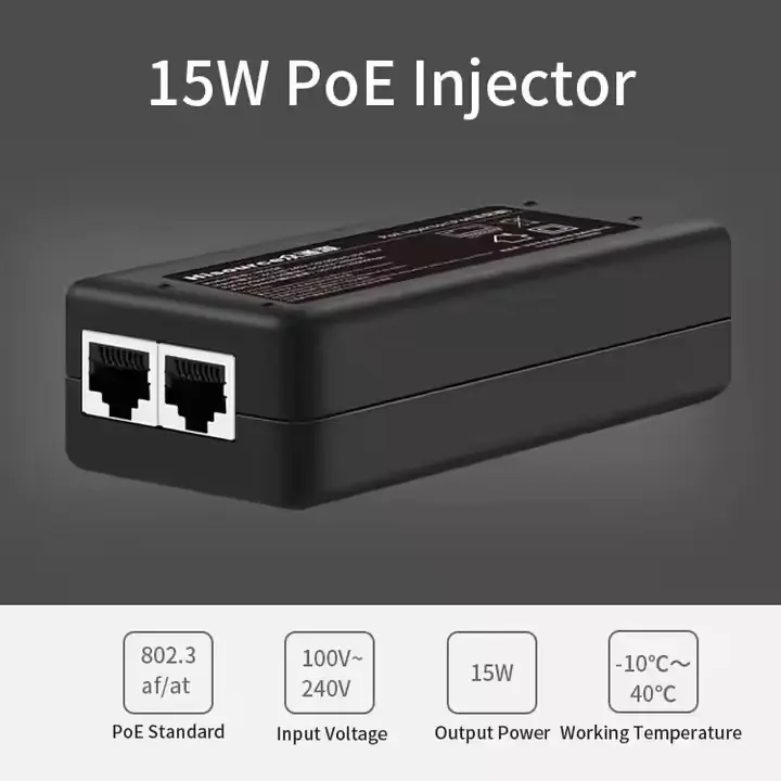 Поддржувајќи глобален напон од 100–240 V, овој 15W IEEE 802.3af PoE адаптер работи ширум светот. Во комбинација со пренос на PoE од 100 метри, тој овозможува флексибилна инсталација и широко се користи како стабилен десктоп PoE инјектор за надзор и мрежни системи.