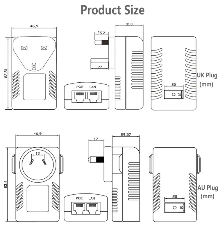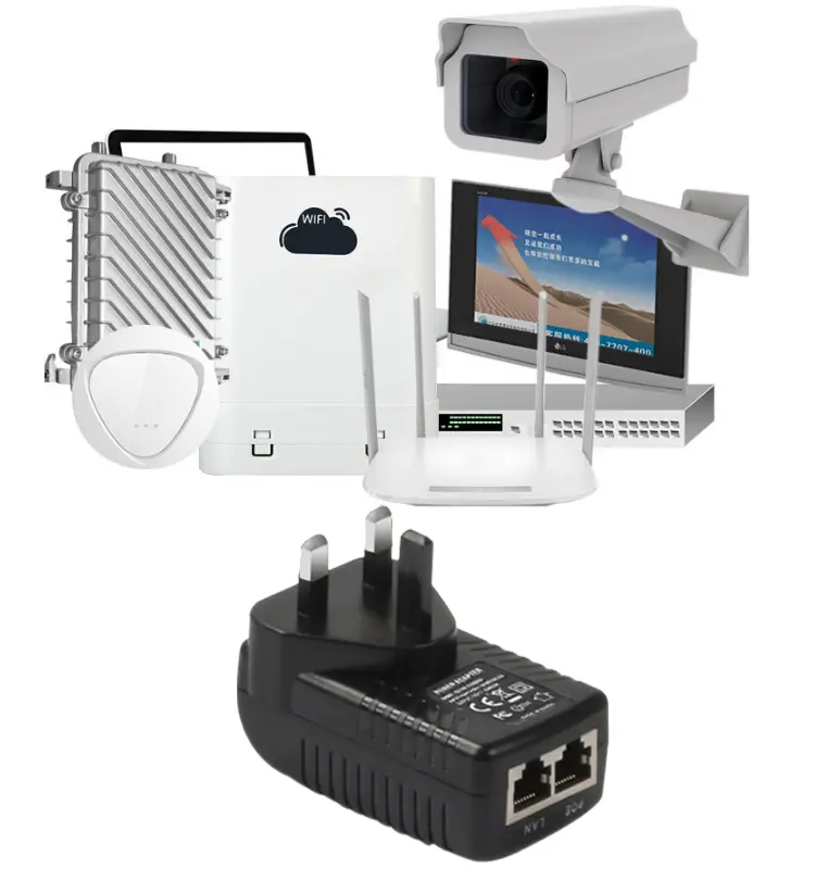 Овој 24V 1A POE адаптер за ѕид поддржува и 24V 1A и 48V 0.5A излез, што одговара на различни POE уреди од 24V и 48V. Дизајнот на POE инјектор со двојна порта овозможува напојување на два уреди во исто време, што значително ја подобрува флексибилноста и ефикасноста на инсталацијата.