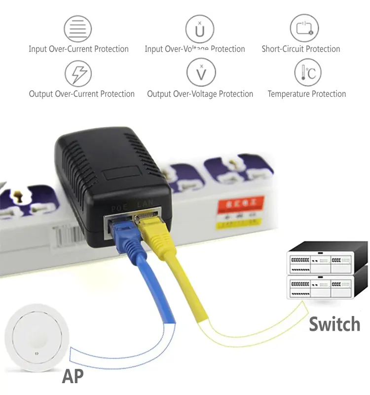 Инјекторот POE со 2 порти обезбедува стабилен напон и струја со ниски бранувања, обезбедувајќи долгорочна стабилна работа. Широк влезен напон 100–240 VAC се прилагодува на глобалните електрични мрежи. Вградената заштита од пренапон, прекумерна струја, краток спој и температура ги штити и POE инјекторот со двојна порта и поврзаната опрема.