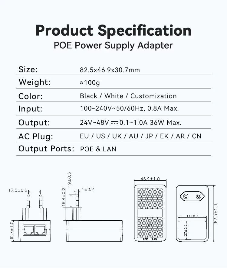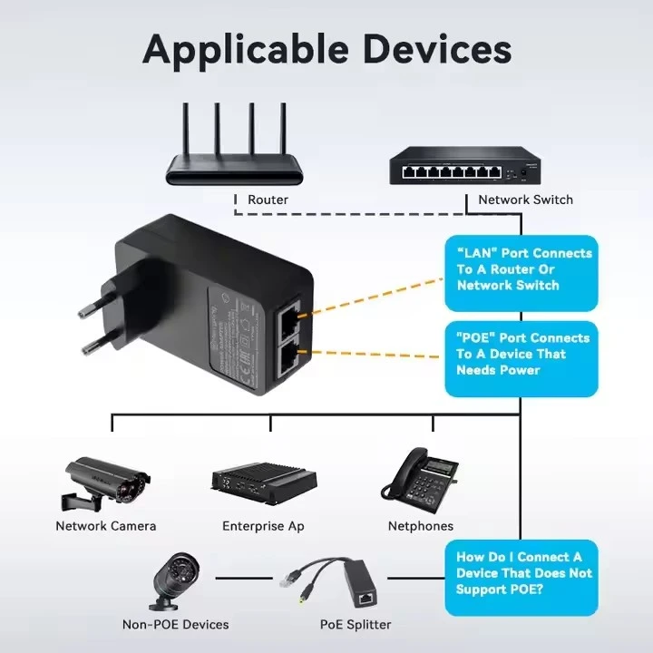 Фабричкиот STARWELL 24V 1A ѕиден EU Plug POE инјектор има универзален AC влез (100-240V) со излези што може да се изберат: 24V/0,5A, 24V/1A или 48V/0,5A. Ги поддржува и пасивните и активните протоколи PoE, со флексибилни доделувања на пинови, вклучувајќи Midspan (4,5+/7,8-) и Endspan (1,2+/3,6-). Целосно усогласен со стандардите IEEE802.3af/at/bt PoE++, тој обезбедува исклучителни способности за брзина на податоци кои се движат од 10/100/1000M до 2,5G/5G/10G bps.