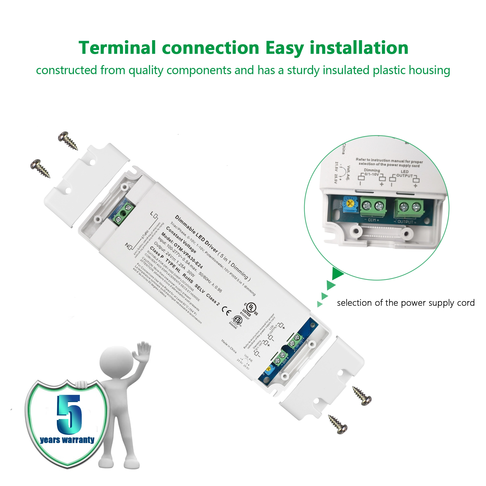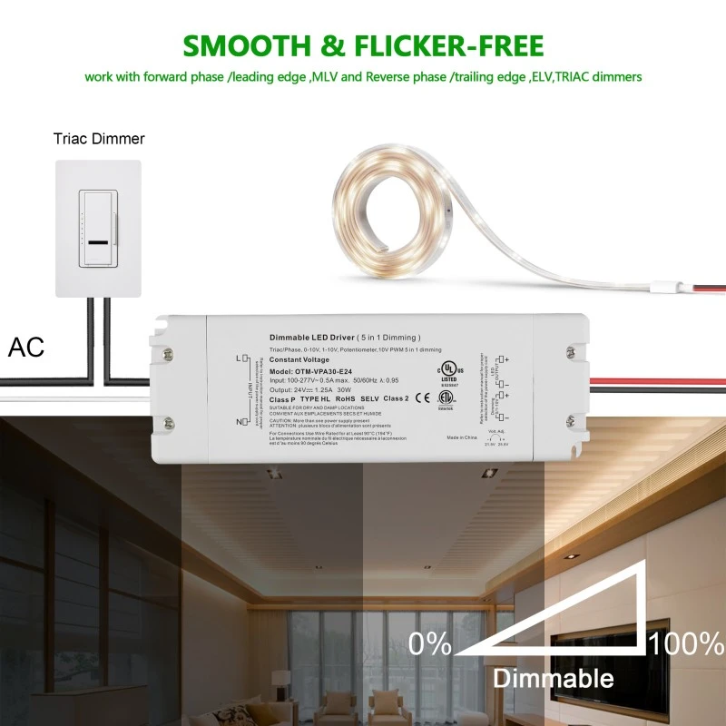 Екслузивниот 24V 30W 0-10V LED драјвер за затемнување на фабриката STARWELL може да испорача максимална излезна моќност до 30W и е специјално дизајниран да постигне беспрекорна контрола на затемнување од 0 до 10V. Се одликува со стабилен излез на напон со коефициент на бранување од ≤ 120mVp-p, што обезбедува перформанси на осветлување без треперење на LED тела. Неговиот опсег на влезен напон е широк (100-240V AC, 50/60Hz), со ефикасност на конверзија до 88%, што овозможува работа за заштеда на енергија. Исто така е во согласност со глобалните стандарди за напон. Овој 0-10V LED драјвер е опремен со различни заштитни функции за да обезбеди сигурна и безбедна употреба во различни апликации за внатрешно и надворешно осветлување.