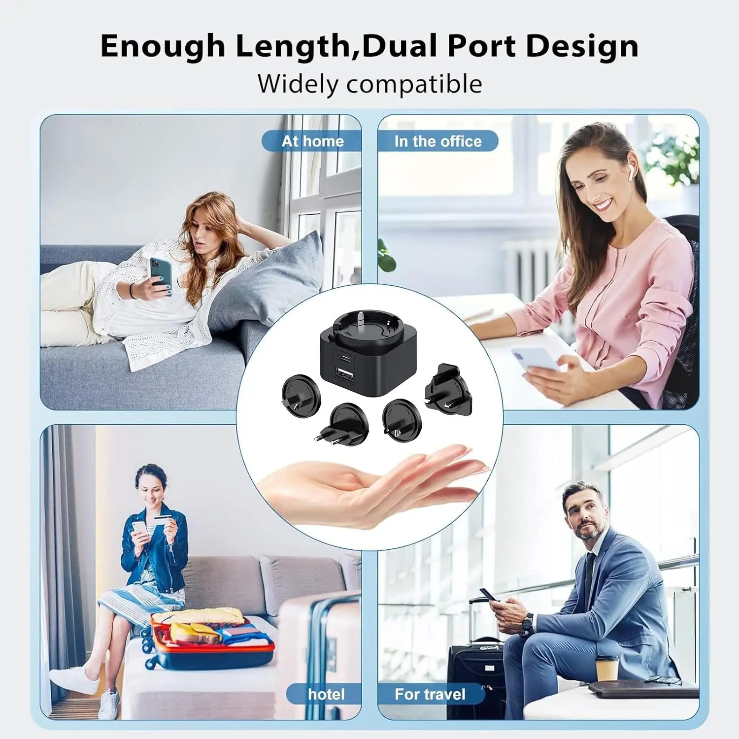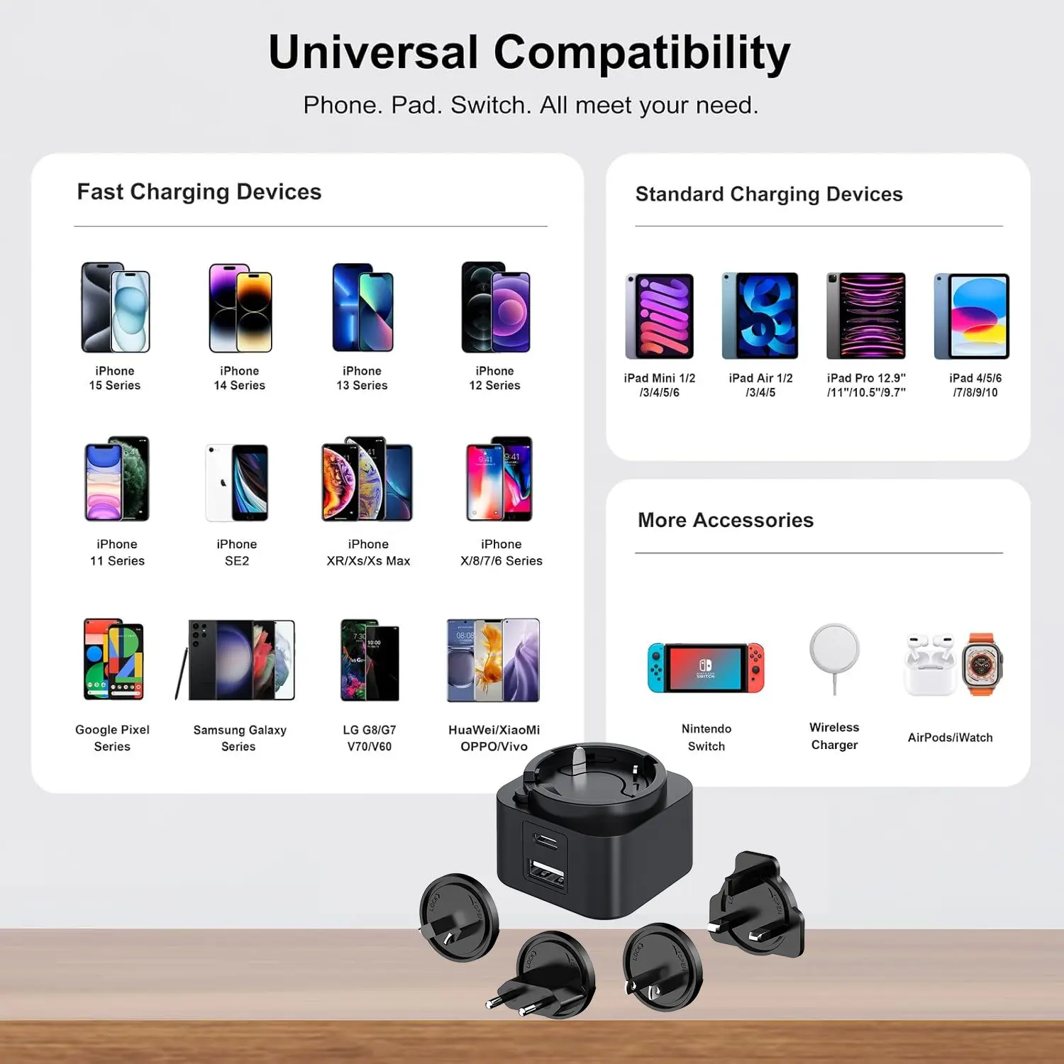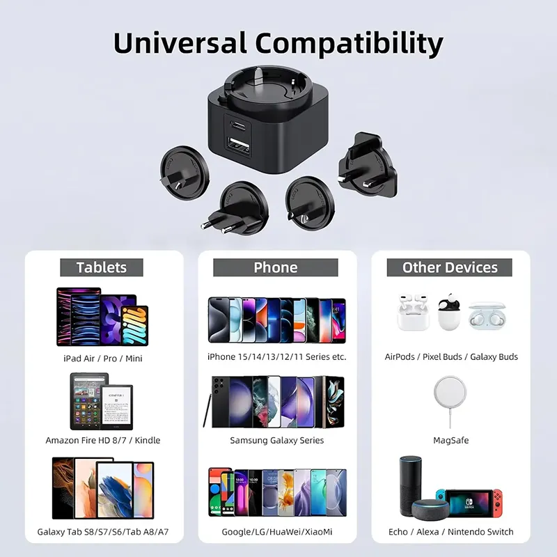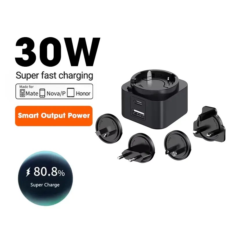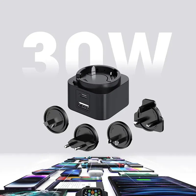 Разновидноста е клучна. Дизајнот со две порти (USB-C/USB-A) ви овозможува да полните два уреди истовремено. 30W заменлив приклучок PD полнач располага со збир на заменливи приклучоци (САД/ЕУ/Велика Британија/Ау), што го прави ваш совршен придружник за патување низ целиот свет. Без разлика дали полните паметен телефон, таблет или лаптоп, универзалната компатибилност обезбедува врвни перформанси.