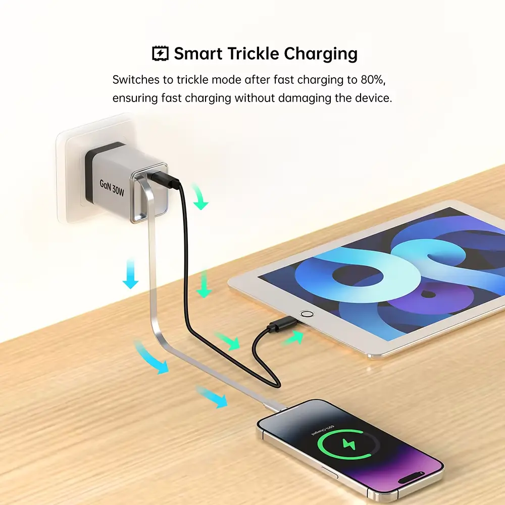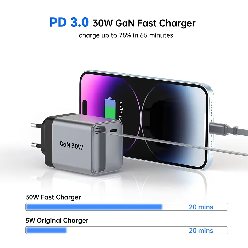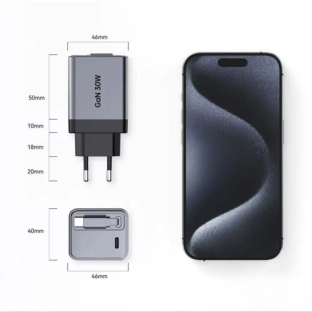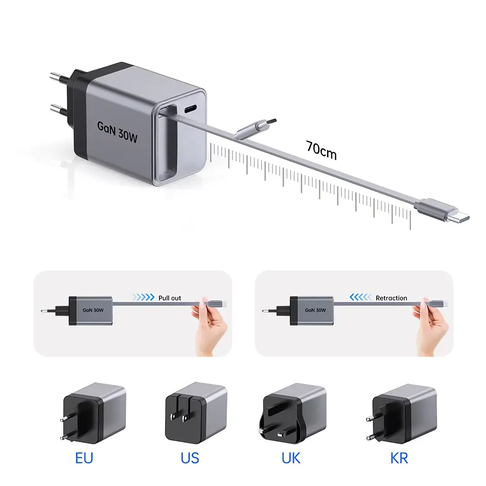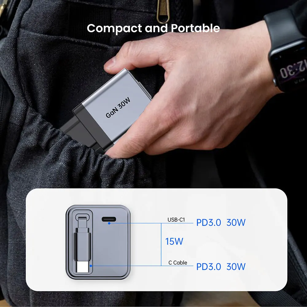 Брз полнач од 30 W со извлекување на кабелот од тип C Ултра лесниот дизајн со големина на џеб го прави лесен за носење. Тоа е совршен избор за дома, канцеларија или патување.