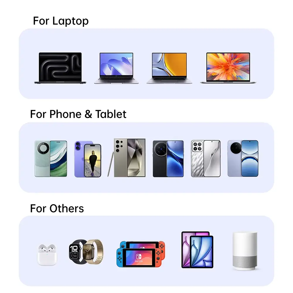 Компатибилен со USB-C уреди, вклучувајќи мобилни телефони, слушалки и додатоци за игри. Автоматски ги открива потребите на уредот за безбедно и ефикасно полнење. 4. Преносливост подготвена за патување