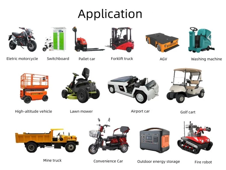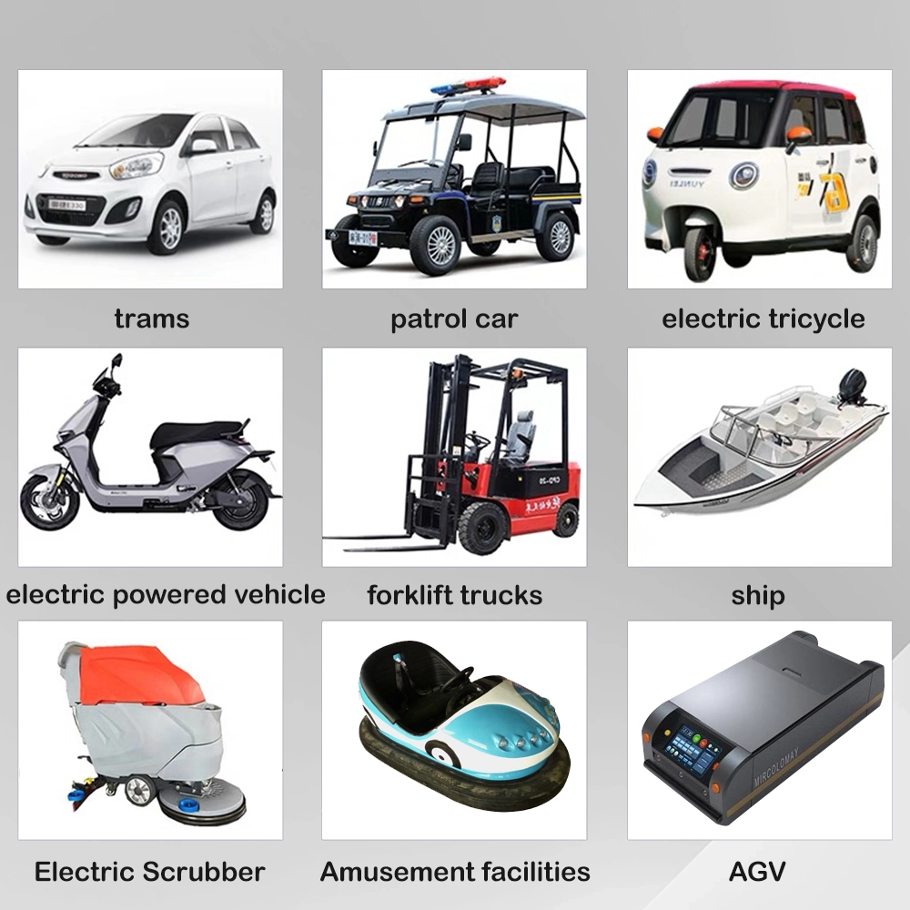 Апликации за производи Автомобили со електрични браници и забавни возења Возила за разгледување и голф колички Патролни возила и безбедносни колички Вилушкари и опрема за ракување со материјали Машини за чистење подови и машини за чистење Автоматизирани водени возила (AGVs) за магацини Електрични бродови, чамци и поморски комунални бродови