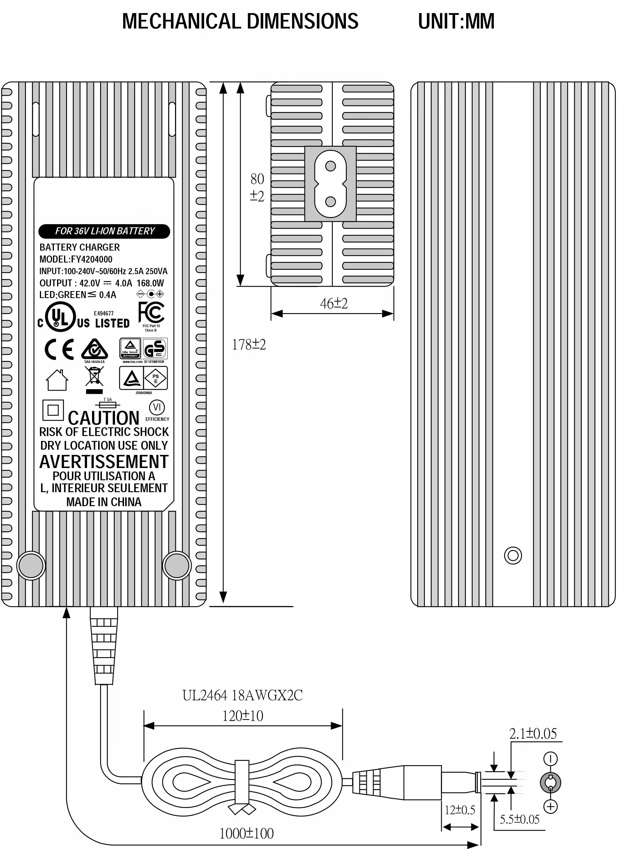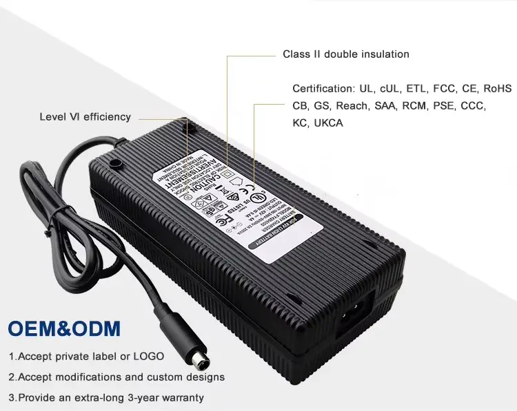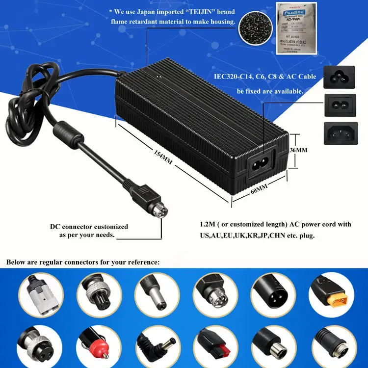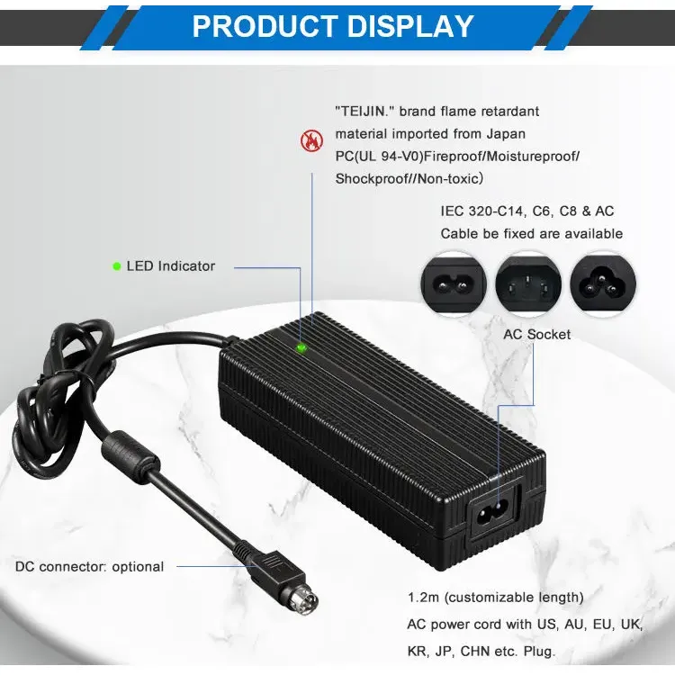 Глобална компатибилност и флексибилен дизајн: Изграден со универзален опсег на влез за наизменична струја од 100–240 VAC, 50/60 Hz, овој полнач поддржува употреба низ целиот свет. Нуди повеќе опции за влез за наизменична струја (IEC320-C14, C6, C8) и доаѓа со 1,2M кабел за напојување кој може да се приспособи со US, AU, EU, UK, KR, JP, CHN и други регионални приклучоци. Куќиштето е изработено од огноотпорен материјал за компјутер, обезбедувајќи издржливост и безбедност при различни работни услови.