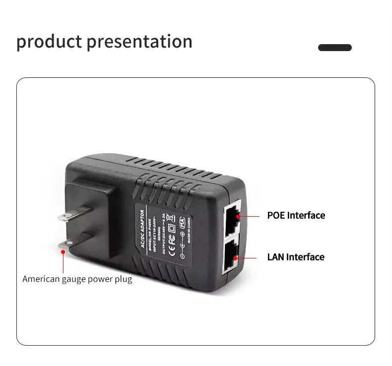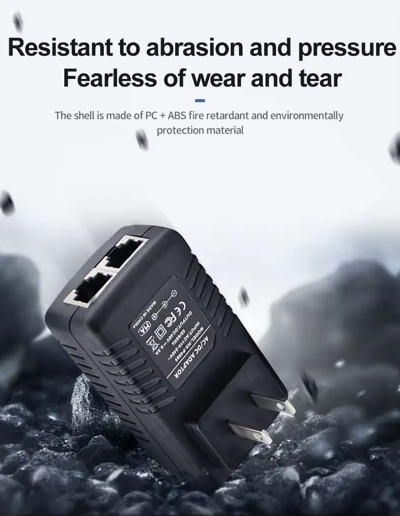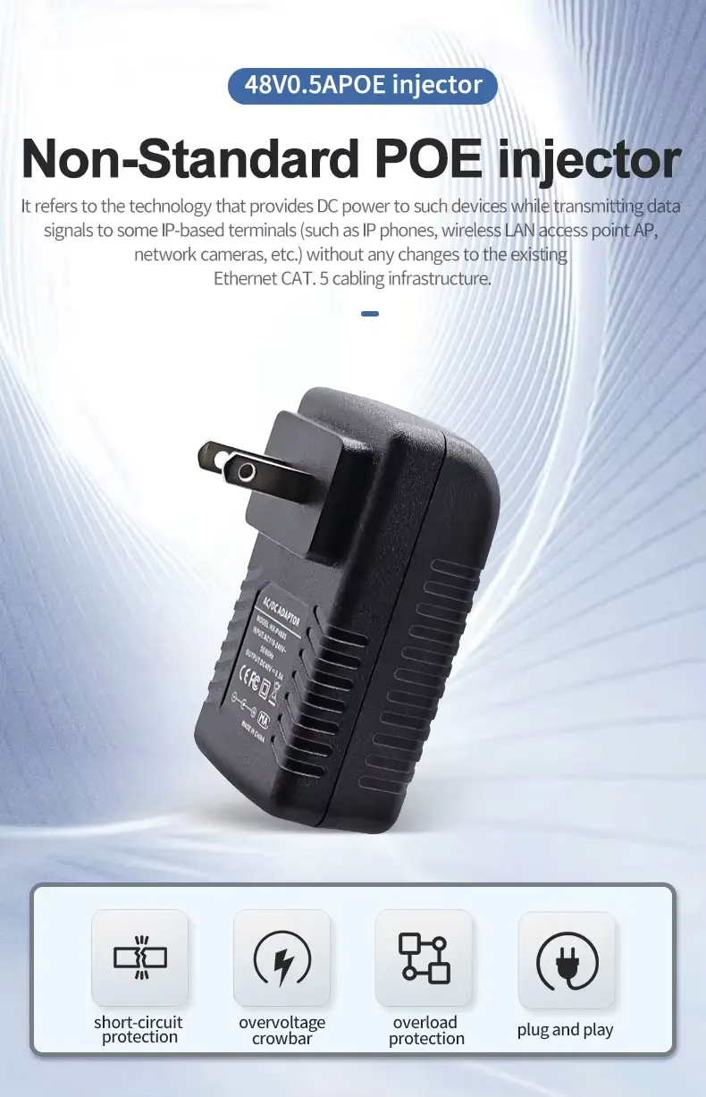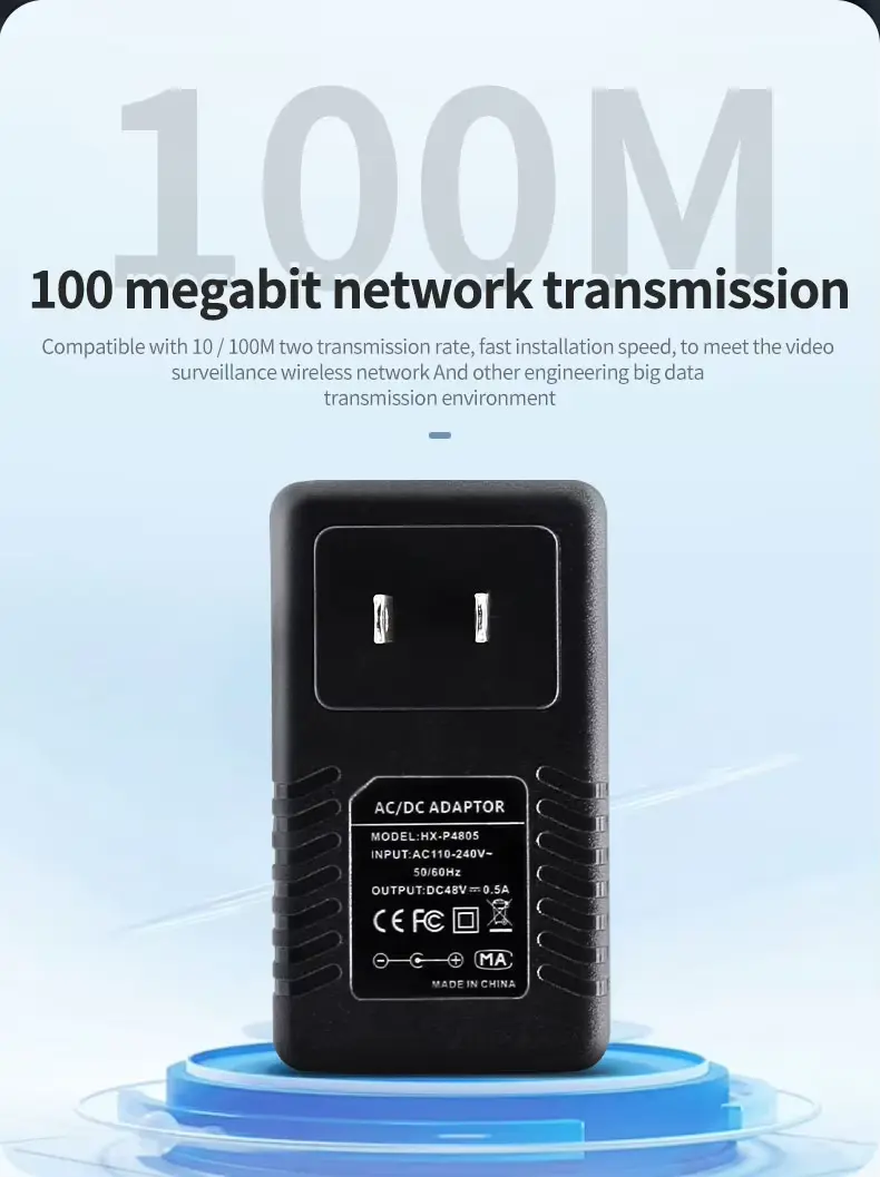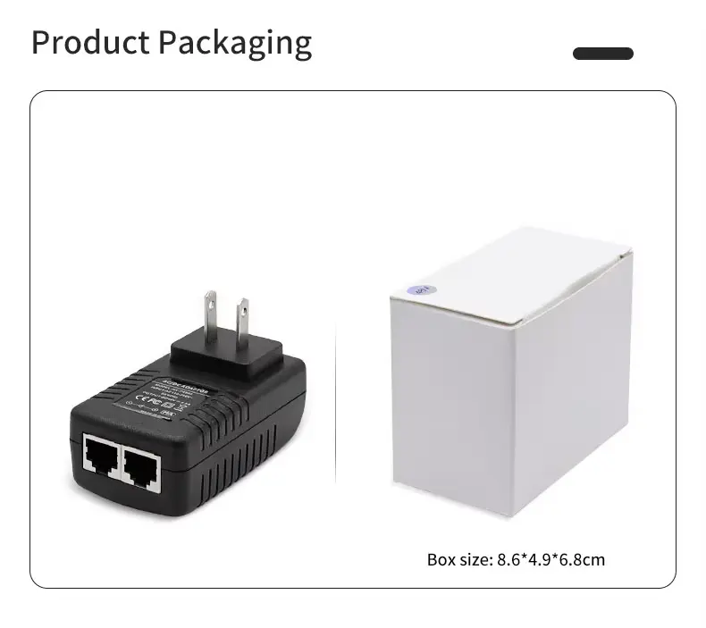 Висококвалитетен 48V 0,5A ѕиден приклучок PoE етернет адаптер за инјектори е понуден од кинескиот производител Starwell. Оваа единица за напојување испорачува излезна моќност од 24W (48V/0.5A), што го прави особено погоден за надворешни безжични уреди — како што се оние од брендови како Ubiquiti и MikroTik — како и IP камери со долг дострел и мрежни мостови. Производот има повеќе механизми за заштита од пренапон, прекумерна струја и кратки споеви; работи во температурен опсег од -10°C до 60°C и доаѓа со гаранција од 5 години.