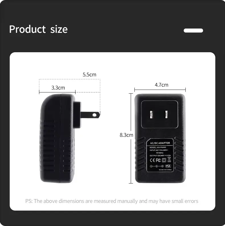 Излез: 48V DC 500mA - Ве молиме не нарачувајте ако вашиот уред бара повеќе од 500 MilliAmps