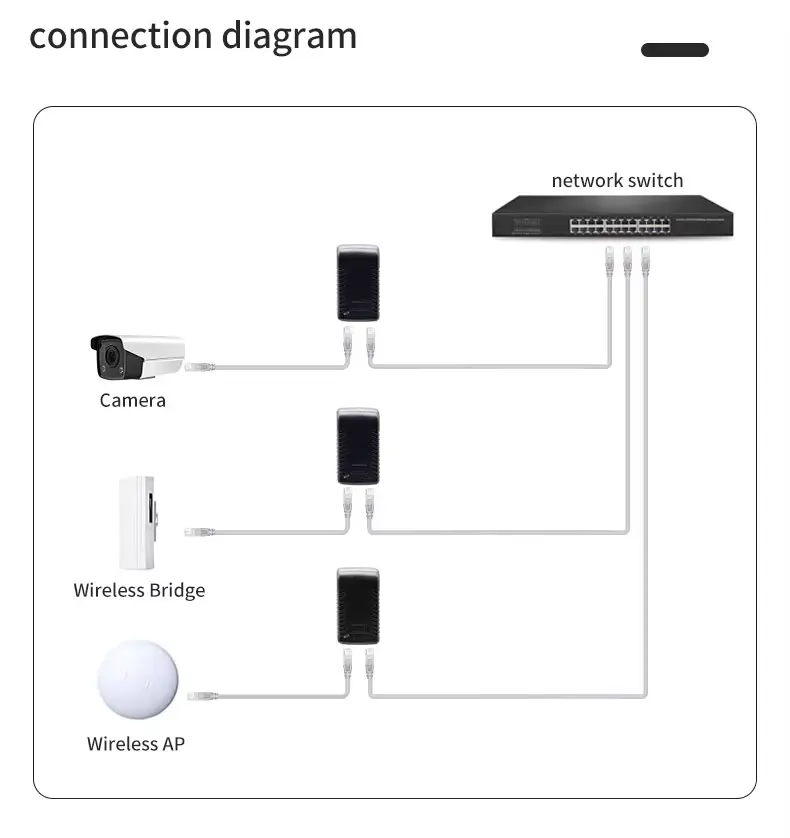 Овој инјектор е специјално дизајниран за мрежни уреди за кои е потребен 48V DC влез преку етернет. Широко е компатибилен со индустриски стандардна опрема, вклучувајќи: