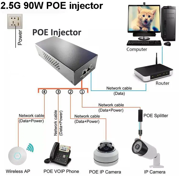 48V 90W PoE-инјектор PoE адаптер од фабриката Starwell, решение со високи перформанси дизајнирано за сигурна енергија и испорака на податоци преку етернет. Целосно усогласен со стандардите IEEE802.3af/at/bt PoE++, овој инјектор обезбедува стабилен пренос на податоци со голема брзина од 2,5G и може да напојува уреди со голема побарувачка како IP камери, безжични AP, мрежни прекинувачи и IP терминали. Неговиот компактен дизајн plug-and-play ја поедноставува инсталацијата во домашни, канцеларии и индустриски мрежи, нудејќи безбедно и ефикасно напојување PoE со минимално поставување.