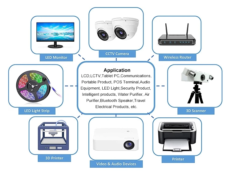 * Повеќе единици за серии 48W: достапни 5V/9V/12V/15V/19V/24V/36V/48V * Безбедност: OCP/OVP/OTP, SCP, автоматско исклучување на преоптоварување, исклучување преку напон, автоматско термичко исклучување. * Широки компатибилности: LED ленти светла, 3D печатач, радио примопредавател, камери за видео надзор, засилувач на сабвуфер за автомобил, аудио засилувач, безжичен рутер, ADSL Cats, овлажнител, HUB, тастатура, BT звучник, монитор, веб-камера, DVR, NVR, аудио/видео напојување