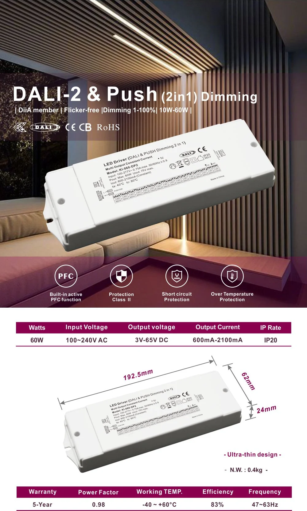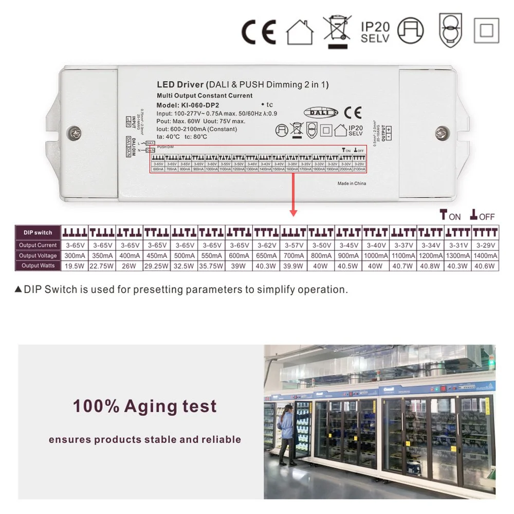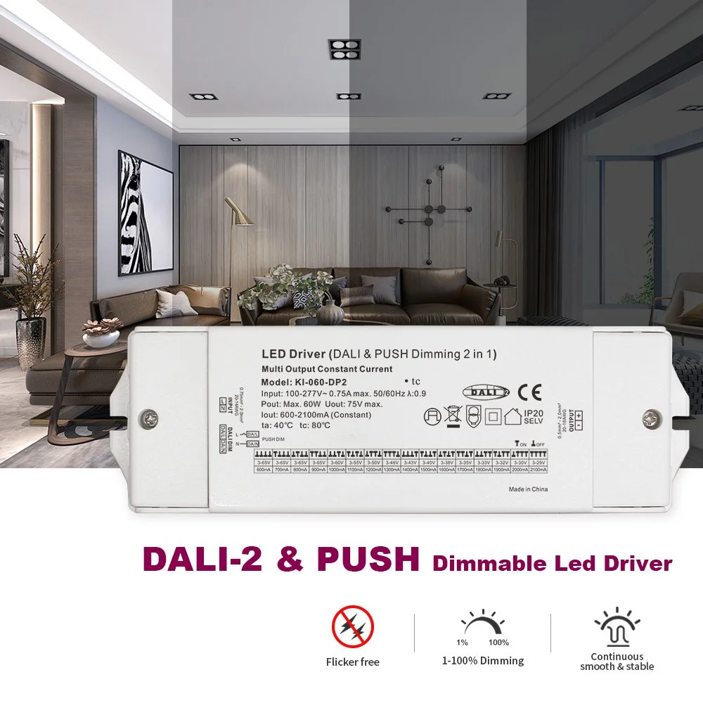 Како професионален лед драјвер во Кина, трајниот 60W константна струја DALI Dimming CCT LED драјверот од фабриката Starwell има прилагодување на температурата на бојата, овозможувајќи им на корисниците линеарно да ја приспособат бојата на светлината во опсег од 2700K до 6500K за да ги задоволат барањата на атмосферата во различни сценарија. Производот има силна компатибилност и е погоден за различни CCT LED модули со температура со двојна боја. 60W Константна струја DALI Dimming CCT LED драјверот е опремен со повеќе заштити како што се пренапон, прекумерна температура и краток спој, обезбедувајќи сигурност и доверливост. Дизајнот на компактното алуминиумско куќиште обезбедува одлична дисипација на топлина и е погоден за скриена инсталација, што го прави идеално решение за двигател за висококвалитетни проекти за осветлување со променлива температура на бојата.