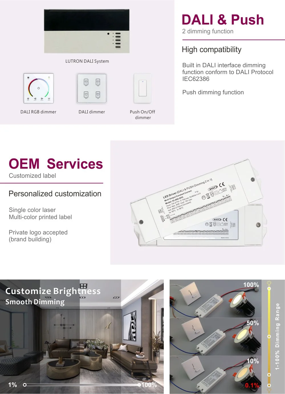 Производот строго се придржува до најновиот стандард за протокол DALI-2, надминувајќи ја основната функција на прекинувачите за затемнување. Овозможува непречено, без скалило затемнување од 0,1% до 100% без треперење или шум. Преку системот DALI, лесно може да се постигне индивидуално адресирање на светилки, групна контрола, претходно поставување на сцената (како што е режимот на состаноци и режим на одмор), темпирани задачи и следење на енергијата. Беспрекорно се интегрира во системот за интелигентно управување на зградата и служи како камен-темелник за создавање ефикасно и паметно осветлување за заштеда на енергија.