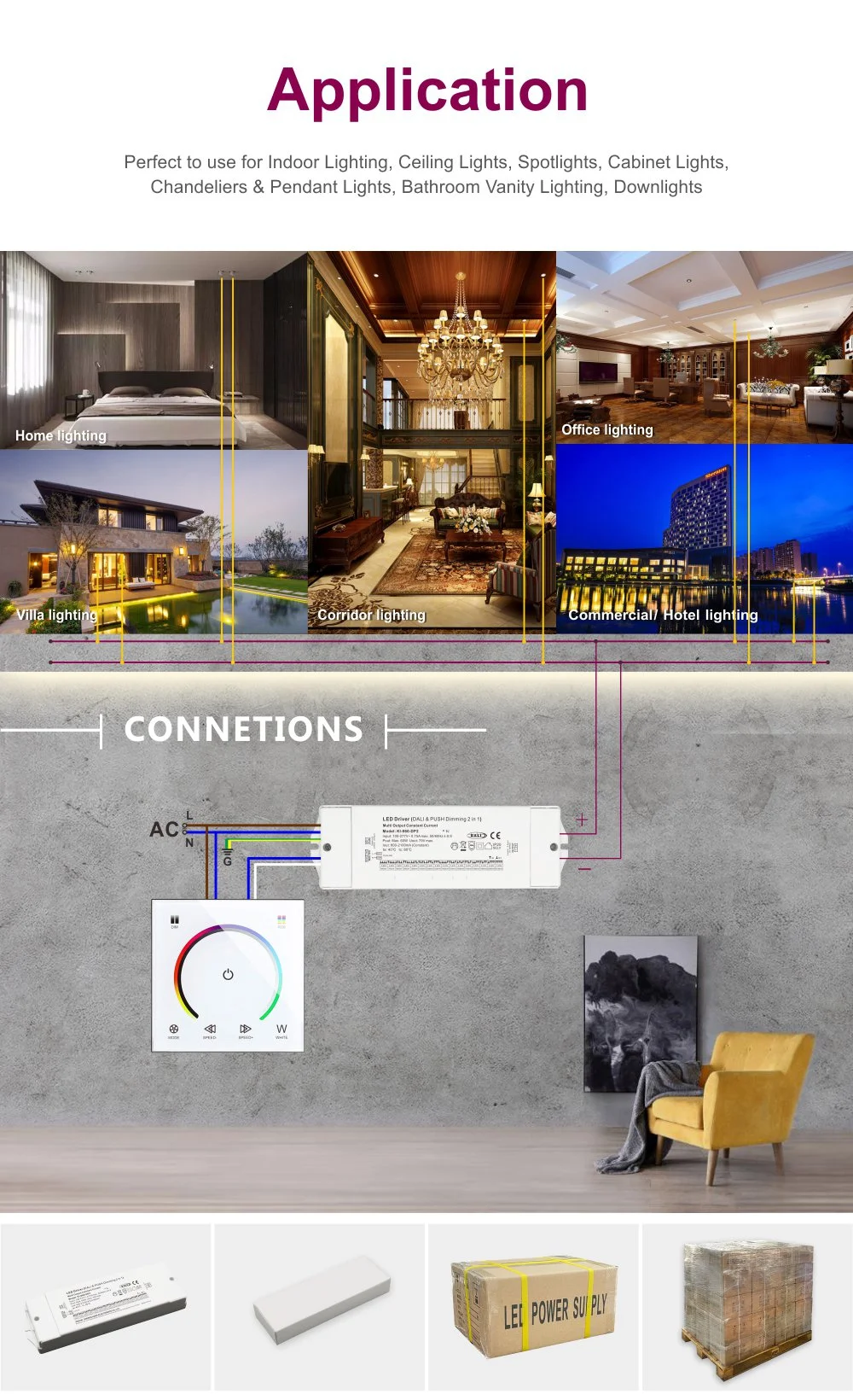 Без разлика дали се работи за LED панел светла во канцелариите, LED светла во трговски центри, скриени светлосни ленти во ходниците на хотелите или акцентно осветлување во домашните простори, овој возач е идеалниот избор. Компактното куќиште од алуминиумска легура со целосно садење обезбедува одлично управување со топлината и долгорочно стабилно работење. Вградените повеќекратни заштитни кола за пренапон, прекумерна струја, краток спој и прегревање обезбедуваат сеопфатна безбедносна заштита за целиот систем за осветлување.