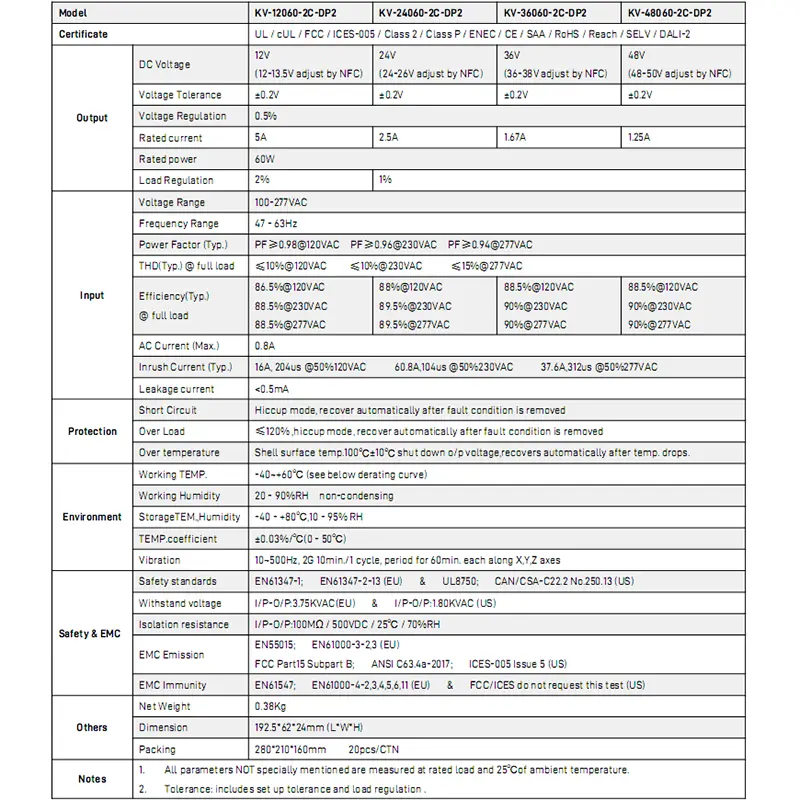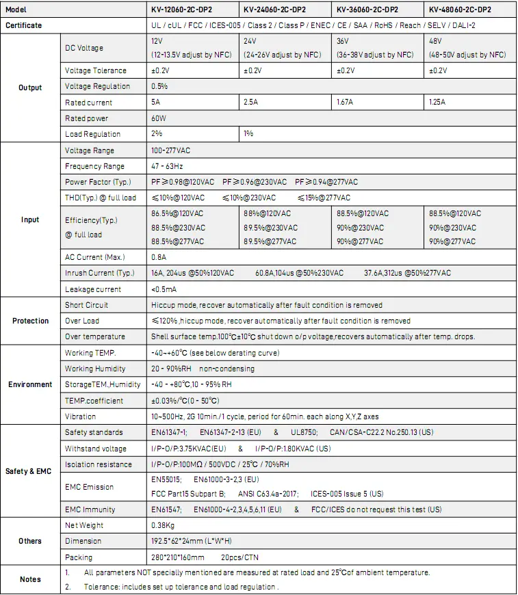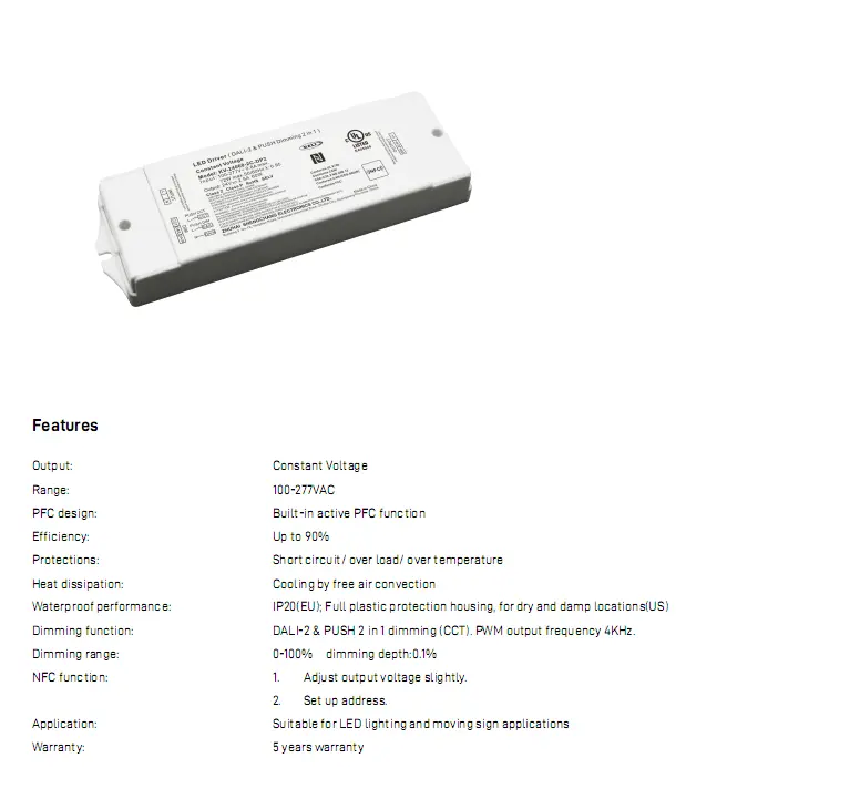 Усвојувајќи го дигиталното затемнување DALI, поддржува 0,1%-100% непречено затемнување без треперење и прецизно прилагодување на CCT од 2700K до 6500K, одржувајќи ја осветленоста конзистентна за време на промена на температурата на бојата. Вградениот активен PFC ја зголемува ефикасноста до 88%, со мала потрошувачка на енергија без оптоварување. Се одликува со мек старт, заштита од пренапон, прекумерна струја и краток спој, што обезбедува безбедно работење.