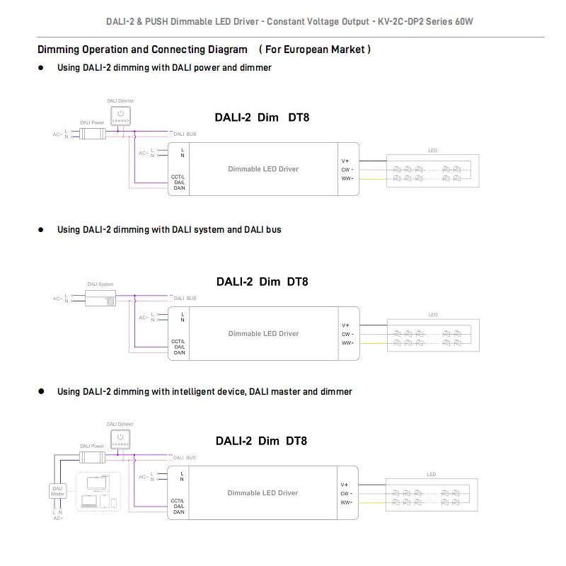 Висококвалитетниот DALI CCT затемнет LED драјвер од 60 W константен напон од фабриката Starwell е професионално моќно решение за приспособливо бело LED осветлување, усогласено со протоколот IEC 62386 DALI-2 DT8. Прифаќа широк влез од 100-240VAC, со стандарден излез на постојан напон од 12V/24V DC, обезбедувајќи стабилна моќност до 60W за LED ленти и панели.
