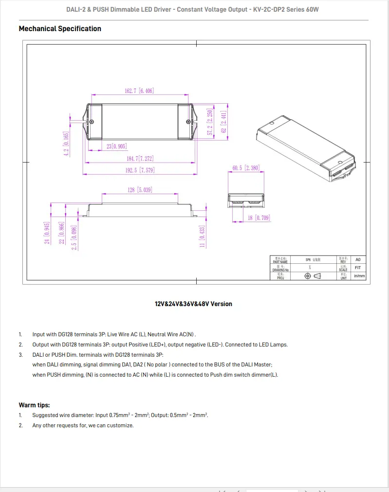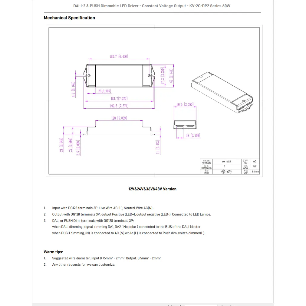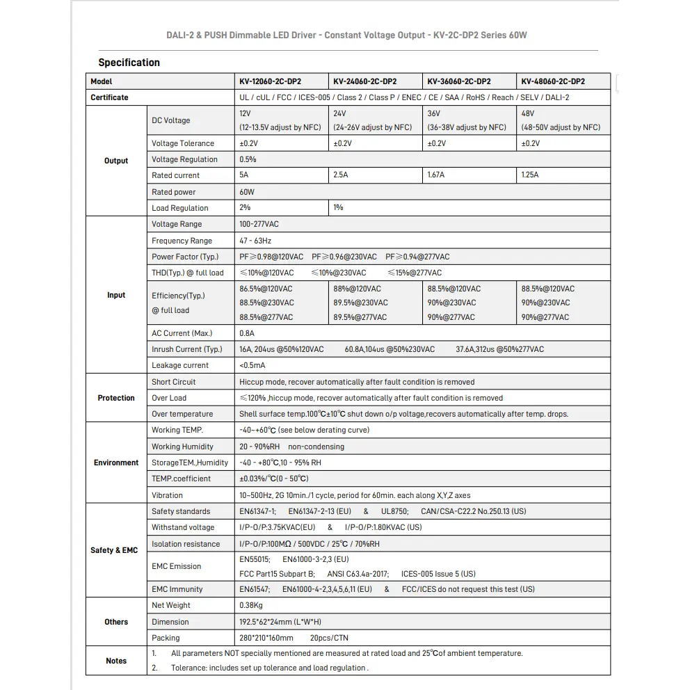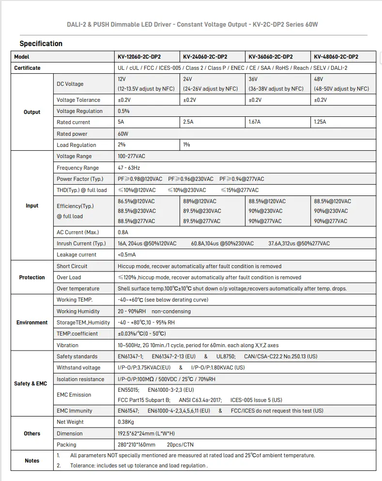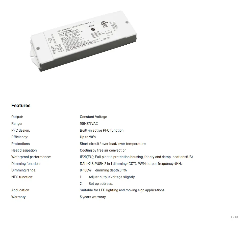 Функција за затемнување: DALI-2 & PUSH 2 во 1 затемнување (CCT). PWM излезна фреквенција 4KHz.