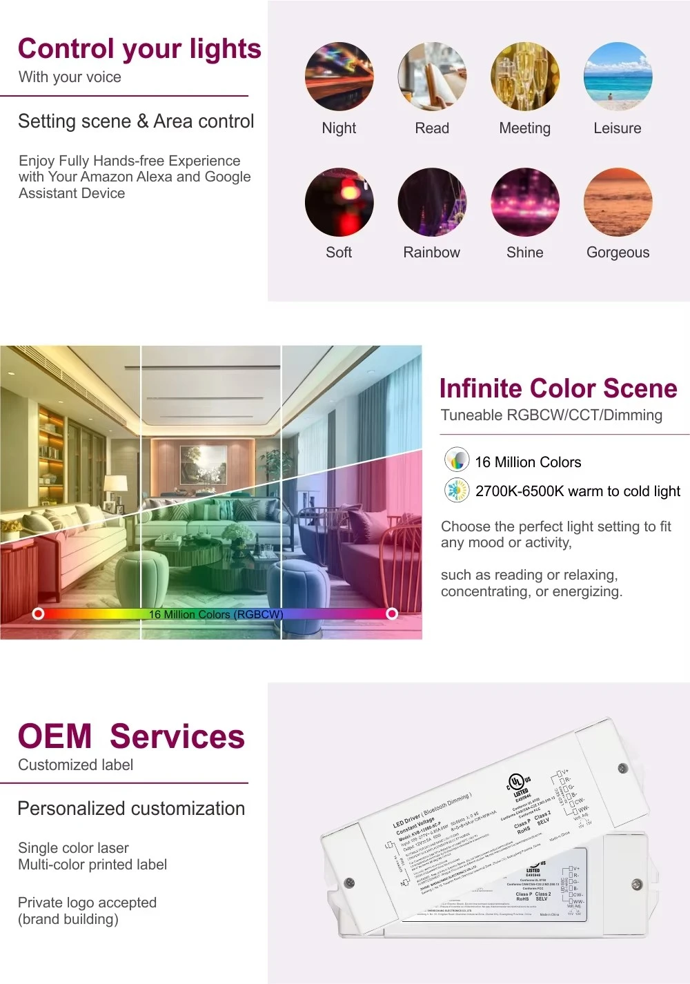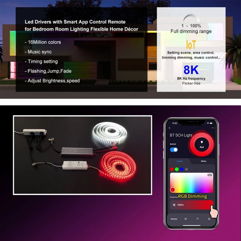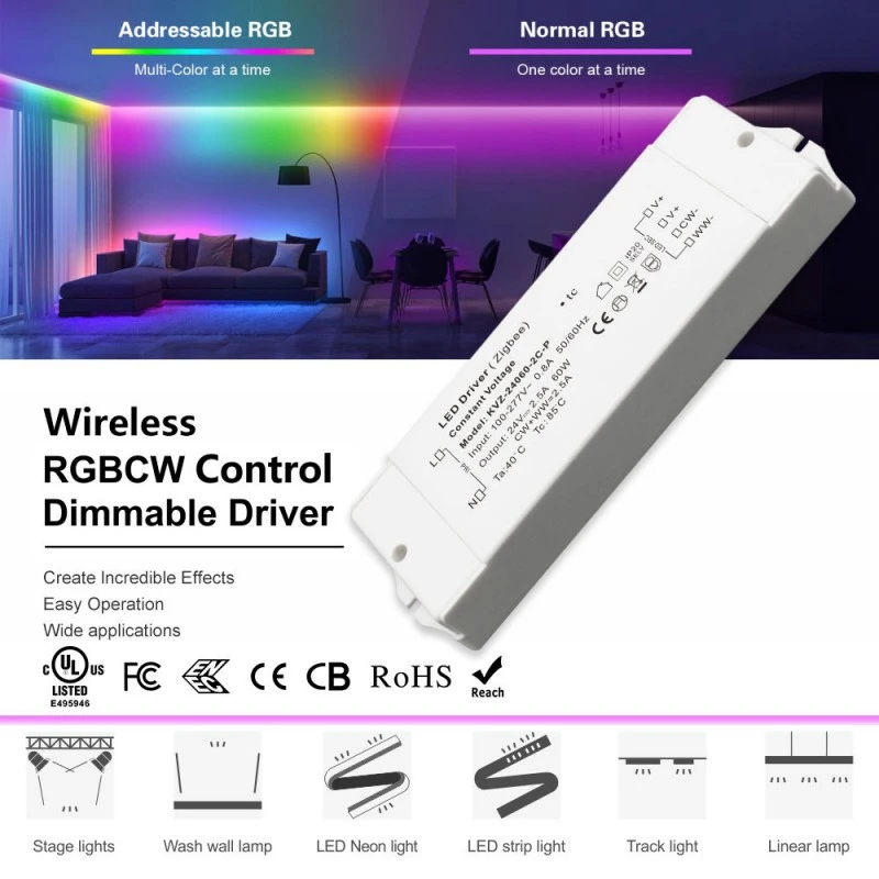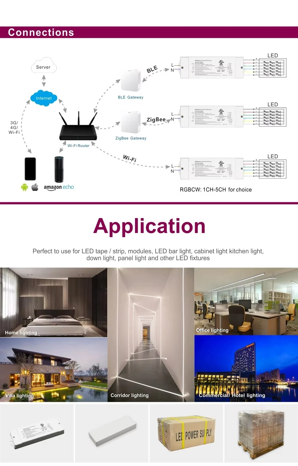 Паметно затемнување на вашите прсти Одликувајќи се со интегриран безжичен модул ZigBee со технологија TUYA, овој драјвер нуди беспрекорна паметна контрола. Прилагодете ја осветленоста преку мобилна апликација или гласовни команди преку Google Home и Amazon Echo. Излезот PWM со висока фреквенција 8K Hz обезбедува целосно затемнување без треперење, додека опсегот на затемнување од 1-100% со длабочина од 1% овозможува непречени транзиции и создавање совршен амбиент.