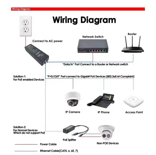 Интеграција на енергија и податоци: Обезбедува стабилна моќност од 48 V и податоци со целосни 1000 Mbps преку еден етернет кабел, елиминирајќи ги дополнителните жици и штекерите за напојување за почисто распоредување.