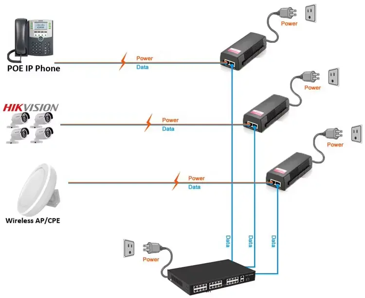Потребно за поврзување со кабли: за целосна испорака од 90 W на подолги растојанија (до 100 m), препорачливо е да се користи Cat6a (или повисок) етернет кабел за да се минимизира загубата на енергија и производството на топлина.