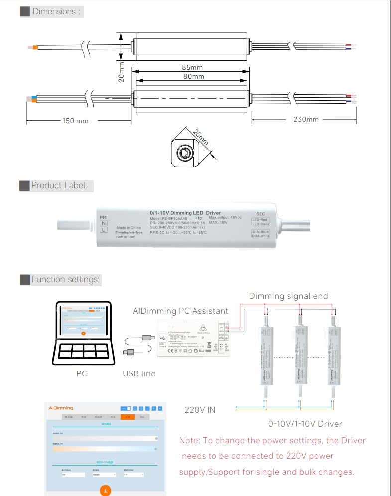 1. Пред да пристапите до сигналот за затемнување, потврдете дали контролниот сигнал е 0-10V или 1-10V, а поставките за сигналот и струјата може да се променат преку AIDimming PC и софтверот. Напојувањето за промена на параметрите мора да се поврзе со напојувањето од 220V, кое може да се менува во серии.