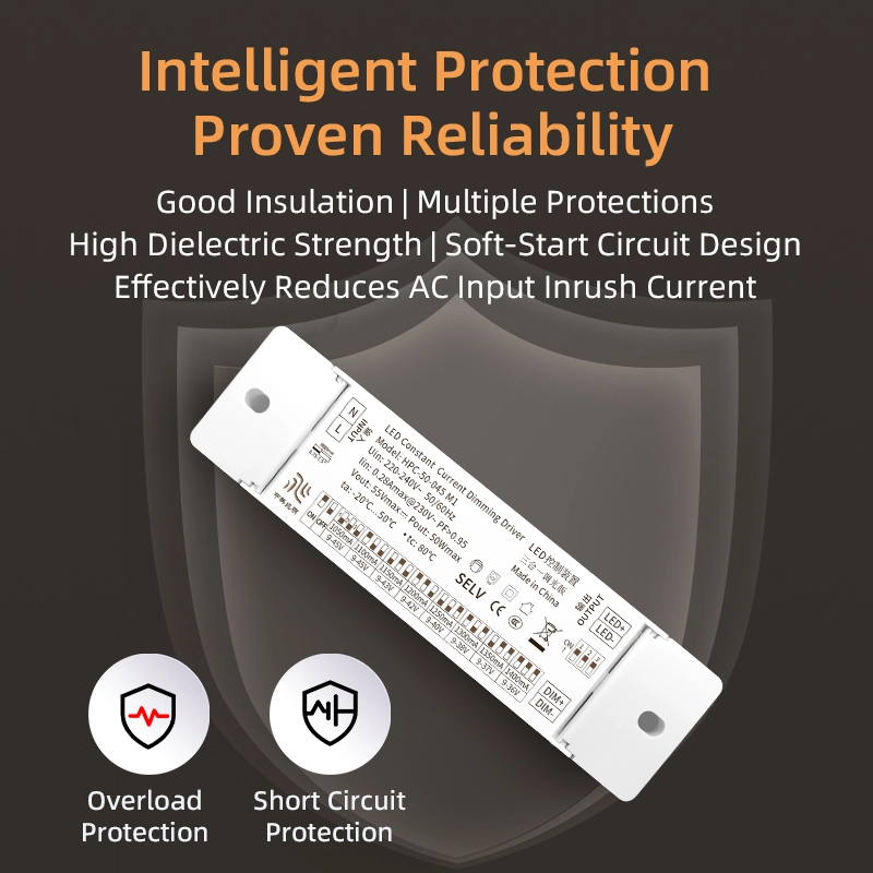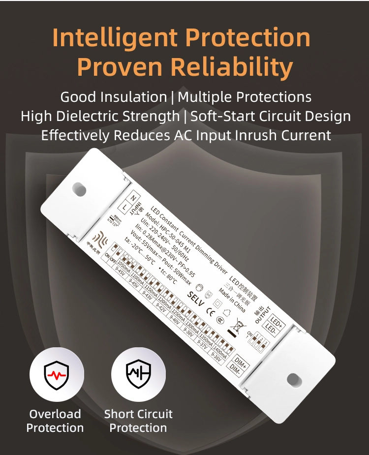 Дизајн на повеќекратна заштита: Изграден со четири заштитни механизми: пренапон (заштитен праг ≥55V), прекумерна струја (заштитен праг ≥0,18A), краток спој и прегревање (заштитна температура ≥110℃). Може брзо да го прекине излезот во случај на ненормални работни услови за да ги заштити возачот и изворите на LED светло од оштетување.