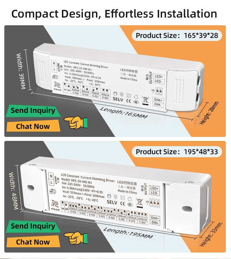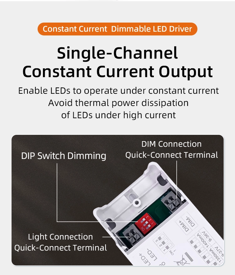 Двојни режими на затемнување: ЛЕД-двигателот за затемнување со постојана струја поддржува влез на сигнал за двојно затемнување од 0-10V/1-10V. Опсегот на затемнување е 0-100%, со линеарност на затемнување од ≥95%. Може да постигне беспрекорна и непречена транзиција од слаба до целосна осветленост без никакво затемнување или застој. Тој е компатибилен со различни интелигентни системи за затемнување и може да ги исполни барањата за осветлување во различни сценарија.