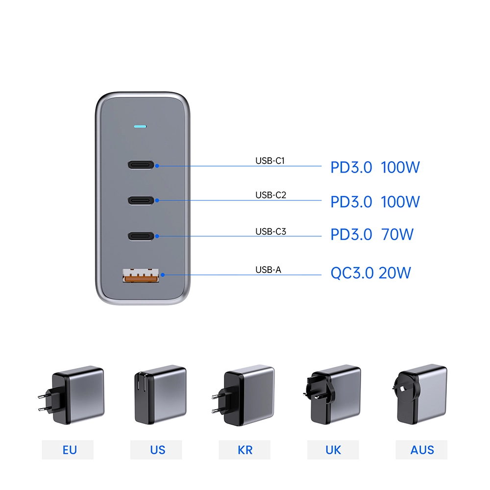Излез C1/C2: 5V3A,9V3A,12V3A,15V3A,20V5A,PPS:3,3-20V5A (максимум 100W) Излез C3: 5V3A,9V3A,12V3A,15V3A,20V3.5A, (70W макс) PPS:3.3-11V5A USB-A излез: 5V3A,9V2A,12V1.67A,SCP:3.3-11V2A (22W Макс) Излез C1+C2/C1+C3:70W+30W Излез C1+C2+ (C3+USB-A): 40W+40W+15W Вкупно: 100 W |