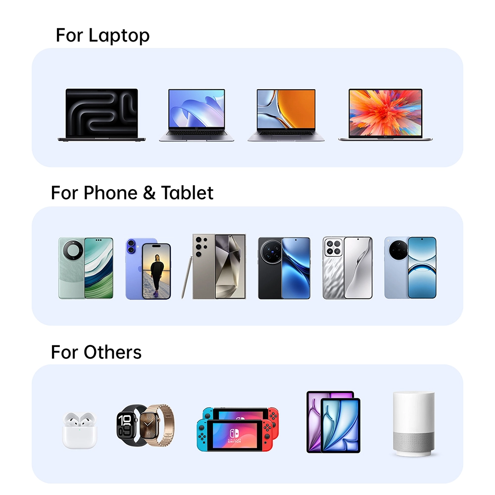 Моќен излез од 100 W: Енергетската станица на вашиот лаптоп Во неговото јадро, портите USB-C1 и C2 поддржуваат врвни излези до 100 W. Овој моќен преносен капацитет е доволен за да ги задоволи барањата за брзо полнење на повеќето лаптопи. Без разлика дали користите MacBook Pro или други ултрабук со високи перформанси, нивните перформанси за полнење може да се споредат со оние на оригиналните полначи, па дури и побрзо. Останете енергични, фокусирајте се на создавањето и продуктивноста и не грижете се за траењето на батеријата кога го користите уредот.