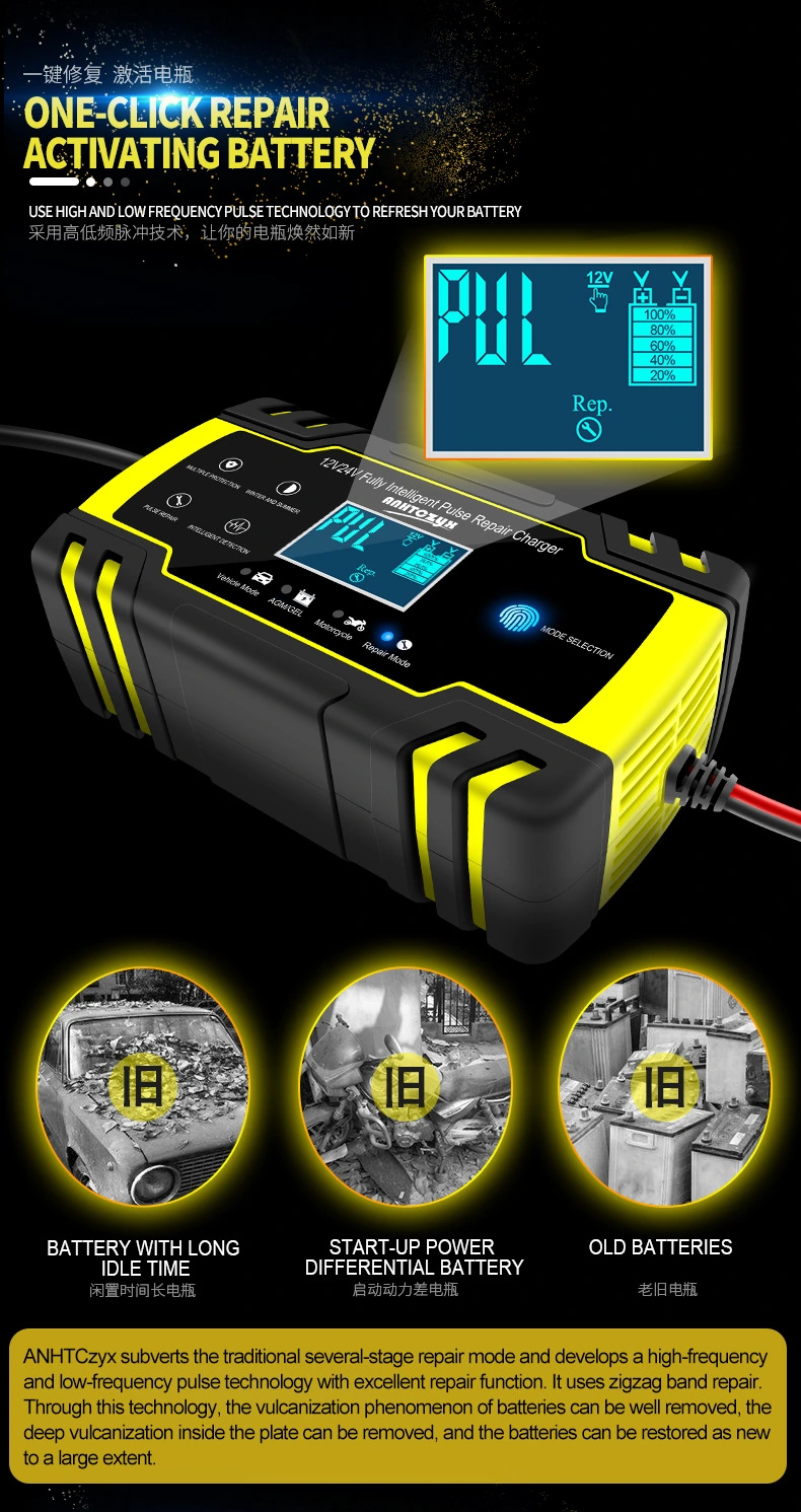 · Функција за поправка на пулсот: користи технологија на пулсот со висока фреквенција за да ја намали кристализацијата на оловниот сулфат (сулфација), помагајќи да се врати изгубениот капацитет кај старите или недоволно наполнетите батерии.