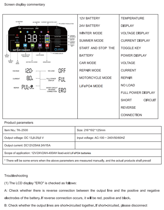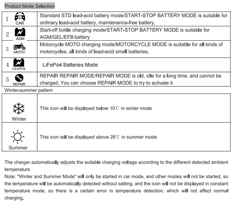 Поддршка за широк тип на батерија: Компатибилен со различни хемикалии на батерии, вклучително и стандардно поплавено (влажно), AGM (абсорбента стаклена подлога), гел и калциум батерии, обезбедувајќи оптимално полнење за секој специфичен тип.