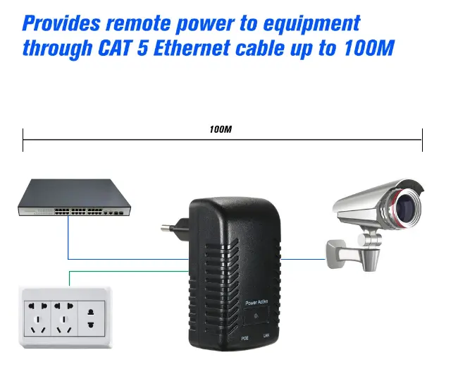 Дизајниран според стандардот 48V IEEE 802.3af, овој нестандарден етернет адаптер за монтирање на ѕид обезбедува стабилна излезна моќност од 15 W, целосно поддржувајќи ги повеќето IP камери напојувани со POE, за кои вообичаено се потребни 15-25 W (со исклучок на PTZ моделите со висока моќност). Исто така, работи сигурно со IP телефони и други уреди во согласност со стандардите 802.3af или 802.3at POE, нудејќи широка компатибилност надвор од поставките за надзор. Изграден за стабилно долгорочно работење, Wall Plug POE Injector ги спојува енергијата и преносот на податоци преку еден етернет кабел, намалувајќи го времето за инсталација и материјалните трошоци за станбени, комерцијални и безбедносни мрежни проекти.