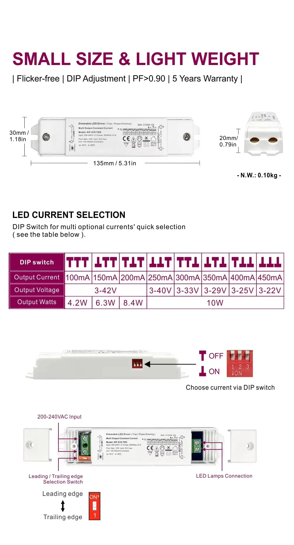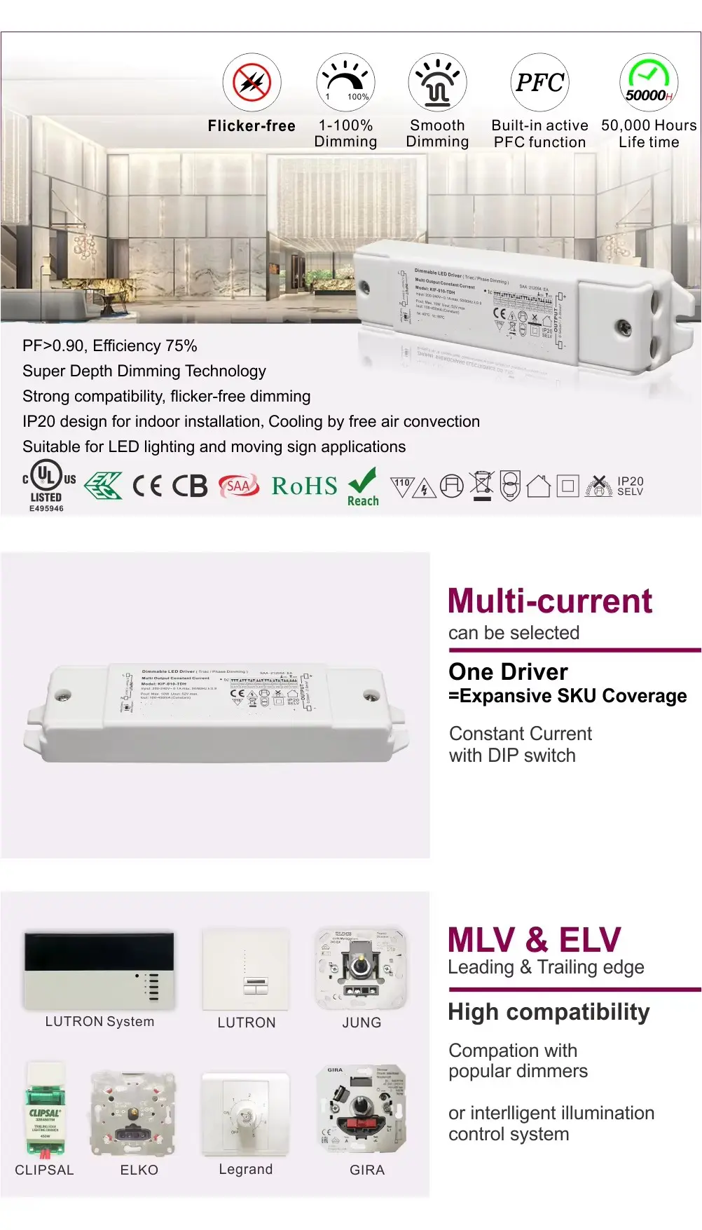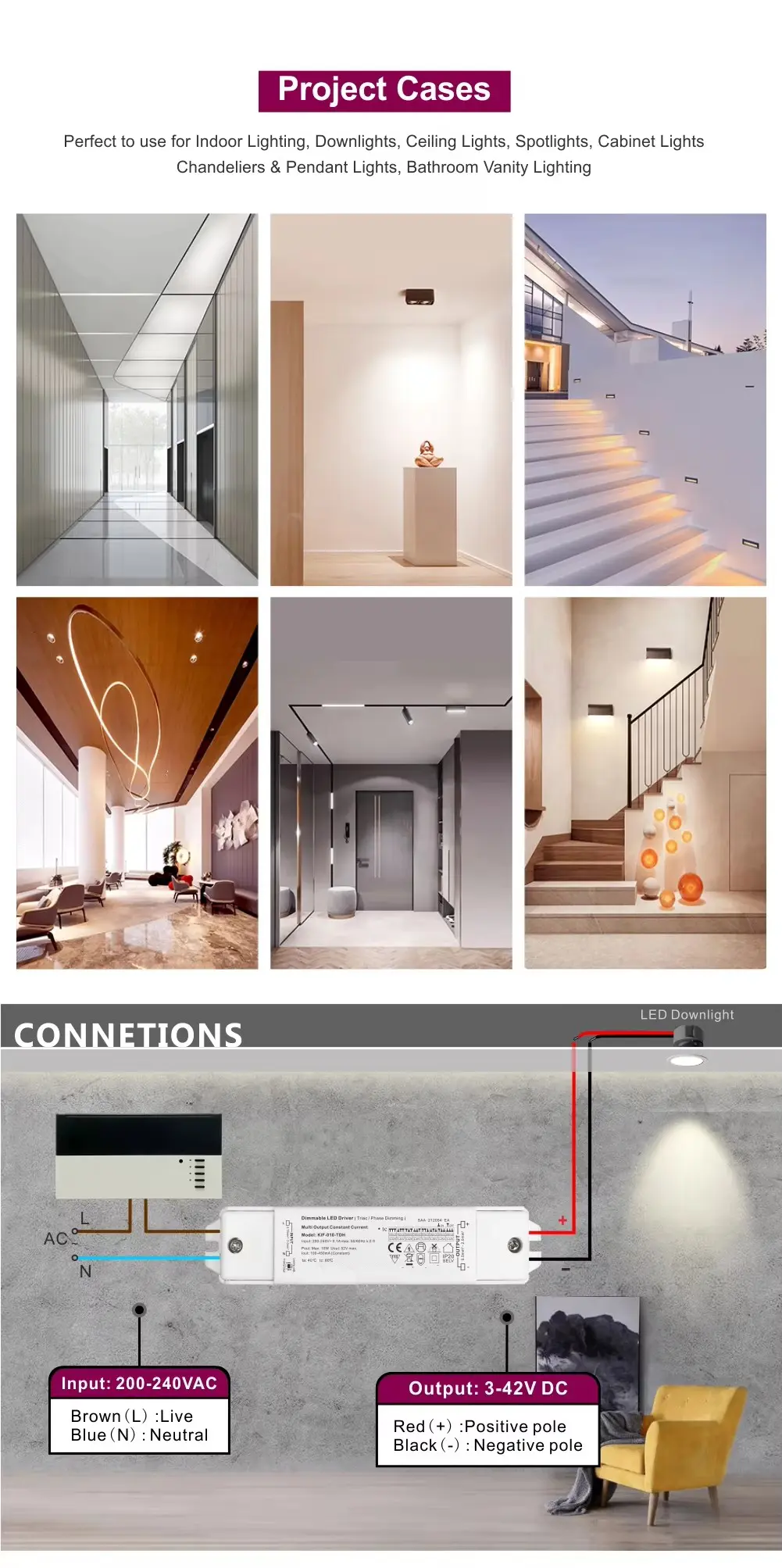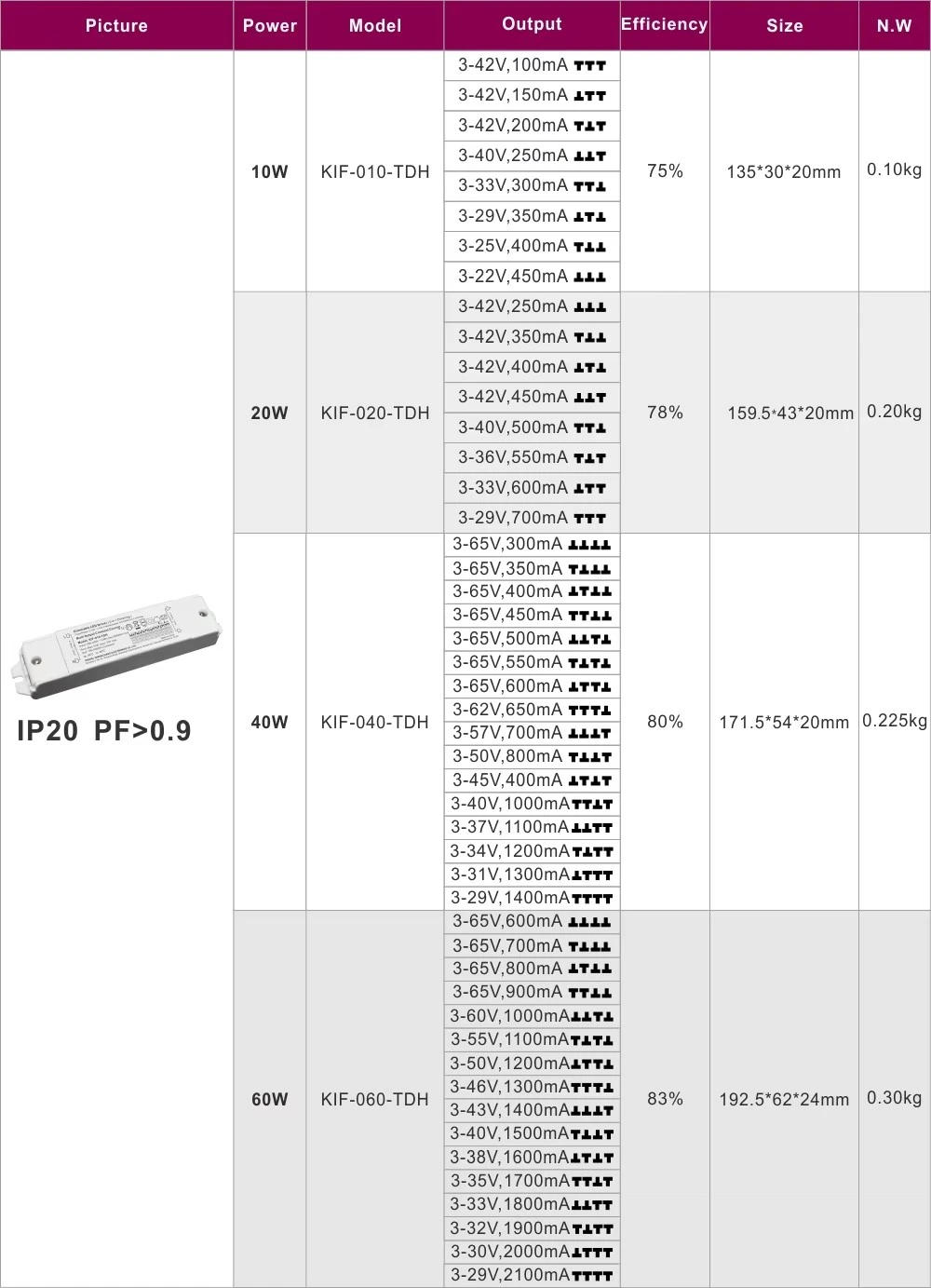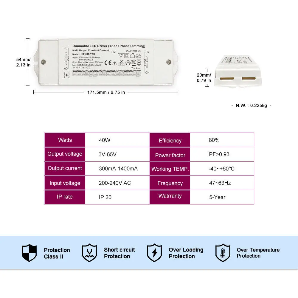 Направен за доверливост, тој се одликува со висока ефикасност, висок фактор на моќност и робусна заштита од прекумерна струја, прекумерна температура и кратки споеви. Неговиот компактен дизајн овозможува лесна инсталација во широк опсег на станбени и комерцијални поставки.